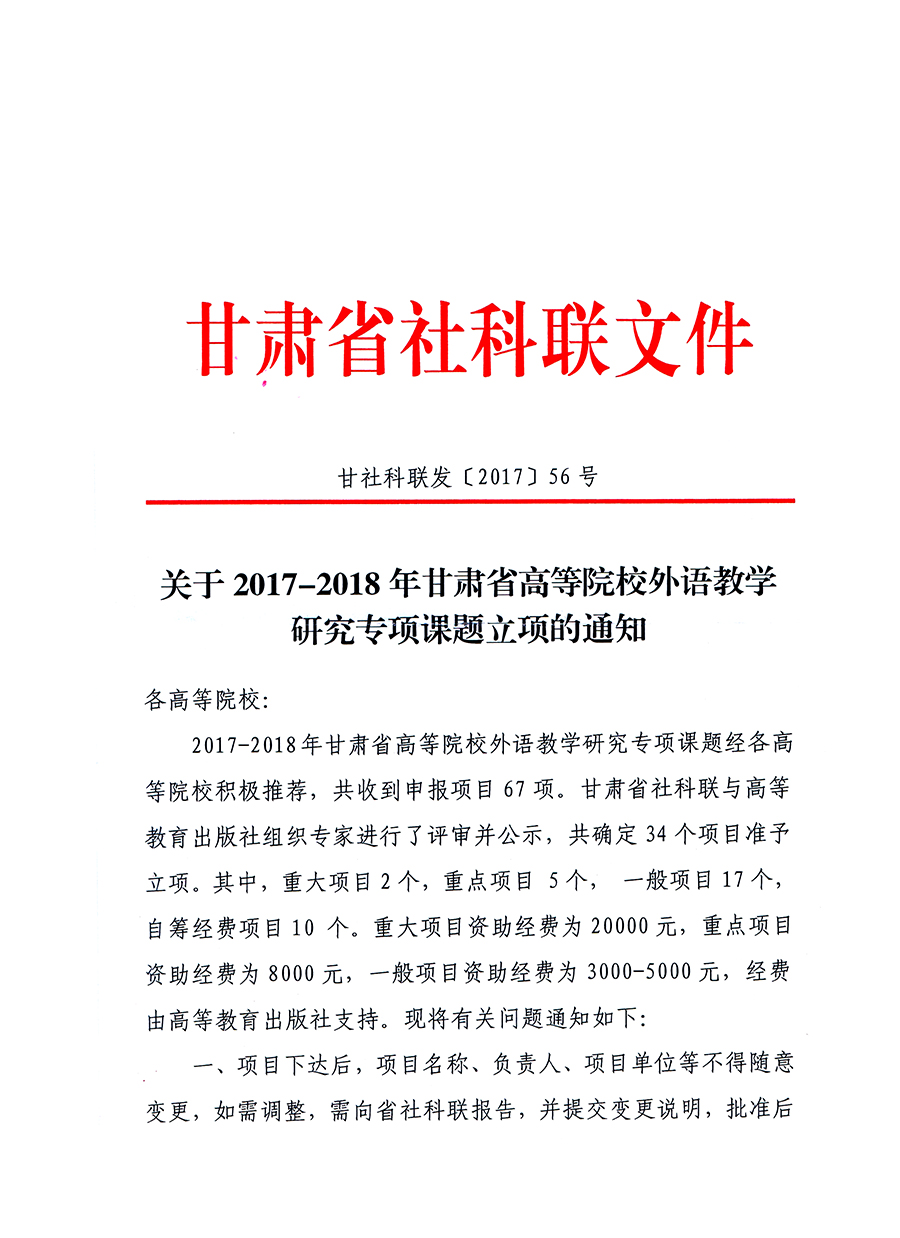 轉(zhuǎn)發(fā)甘肅省社科聯(lián)“關(guān)于2017-2018年甘肅省高等院校外語教學(xué)研究專項課題立項的通知”