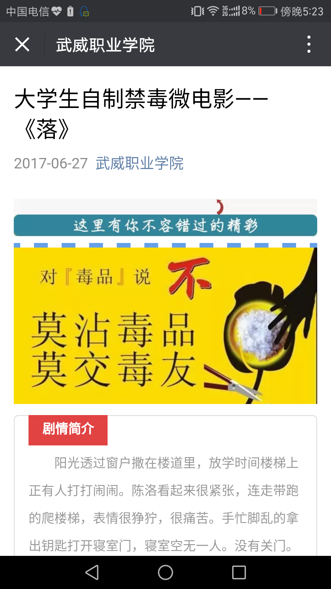 為進一步推進平安校園建設,不斷推進青少年毒品預防教育“6·27”工程活動的深入開展,增強師生的禁毒意識,武威職業(yè)學院根據(jù)甘肅省禁毒委員會辦公室、甘肅省教育廳《關(guān)于做好2017年秋季開學在校學生毒品預防教育工作的通知》要求,在全院范圍內(nèi)開展了禁毒宣傳教育“五個一”活動。