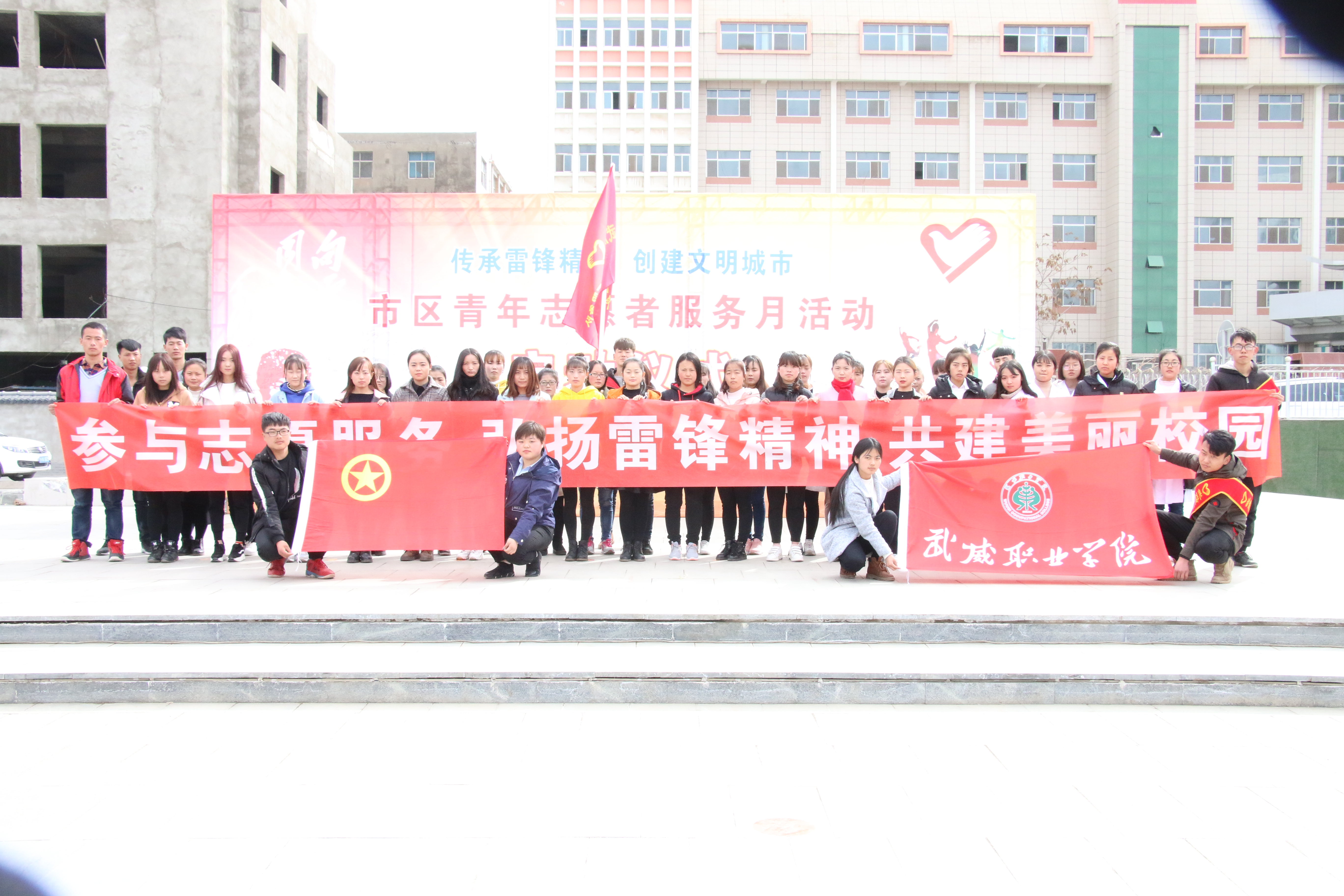 今年是毛澤東等老一輩革命家為雷鋒同志題詞55周年,3月5日是中國青年志愿者服務(wù)日。 3月5日下午,學(xué)院50名志愿者在武威市文化廣場參加了全市志愿者服務(wù)月活動啟動儀式,活動現(xiàn)場氣氛熱烈,市領(lǐng)導(dǎo)為我院志愿服務(wù)隊進(jìn)行了授旗,青年志愿者代表宣讀了倡議書,全體志愿者重溫了青年志愿者誓詞。