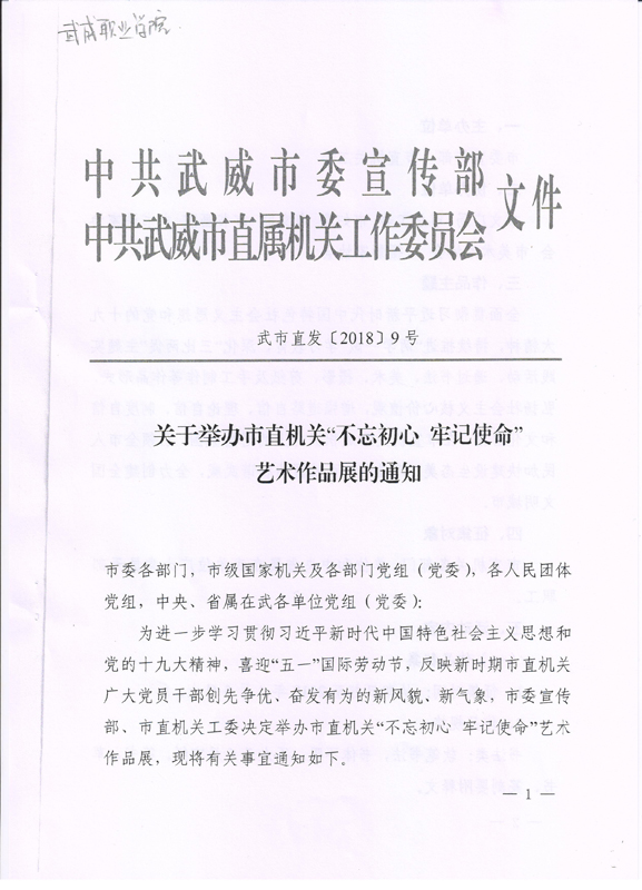 關(guān)于組織參加武威市直屬機(jī)關(guān)“不忘初心 牢記使命”藝術(shù)作品展的通知