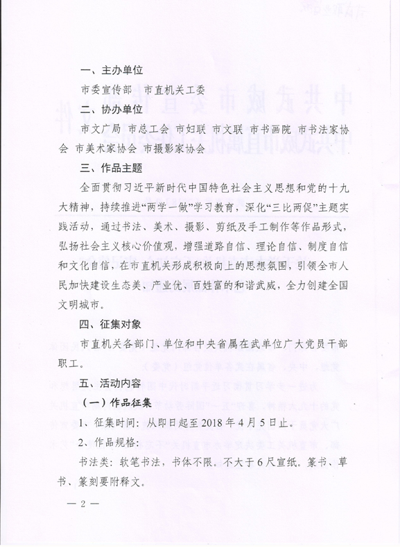 現(xiàn)將中共武威市委宣傳部、中共武威市直屬機(jī)關(guān)工作委員會(huì)《關(guān)于舉辦市直機(jī)關(guān)“不忘初心? 牢記使命”藝術(shù)作品展的通知》(武市直發(fā)〔2018〕9號(hào))轉(zhuǎn)發(fā)你們,請(qǐng)各部門、單位根據(jù)要求認(rèn)真組織,積極參與。將參賽作品于4月2日前報(bào)宣傳統(tǒng)戰(zhàn)部辦公室,宣傳統(tǒng)戰(zhàn)部對(duì)報(bào)送作品匯總后統(tǒng)一報(bào)送市直屬機(jī)關(guān)工委。