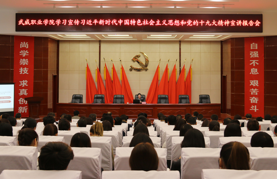 為進(jìn)一步加強(qiáng)對(duì)習(xí)近平新時(shí)代中國(guó)特色社會(huì)主義思想和黨的十九大精神的學(xué)習(xí)宣傳教育,4月9日下午,學(xué)院黨委在菁英廳舉行“武威職業(yè)學(xué)院深入學(xué)習(xí)宣傳貫徹習(xí)近平新時(shí)代中國(guó)特色社會(huì)主義思想和黨的十九大精神宣講報(bào)告會(huì)”,邀請(qǐng)武威市委講師團(tuán)成員、市委黨校副教授蔡生菊為學(xué)院各院系師生代表、副科級(jí)以上領(lǐng)導(dǎo)干部、直屬附屬醫(yī)院領(lǐng)導(dǎo)共計(jì)200余人作宣講報(bào)告。宣講報(bào)告會(huì)由宣傳統(tǒng)戰(zhàn)部部長(zhǎng)王繼林主持。