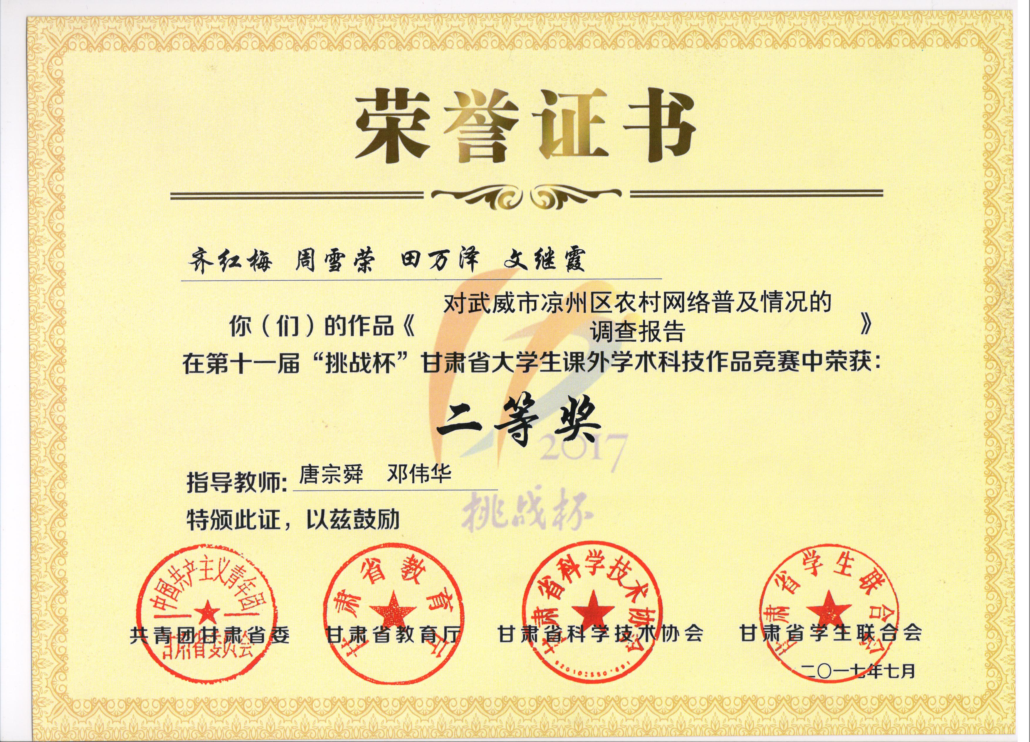 決賽期間,副院長田迎春作為嘉賓出席了終審決賽開幕式,并親臨展演現(xiàn)場指導,鼓勵同學們取得好成績。在公開展示、現(xiàn)場路演、終審答辯等環(huán)節(jié),我院代表隊表現(xiàn)出色,給評審專家和前來觀摩的各高校師生留下了深刻的印象。最終經過評審委員會終審評審,電子信息工程系選送的《對武威市涼州區(qū)農村網(wǎng)絡普及情況的調查報告》作品榮獲二等獎?! ?/p>