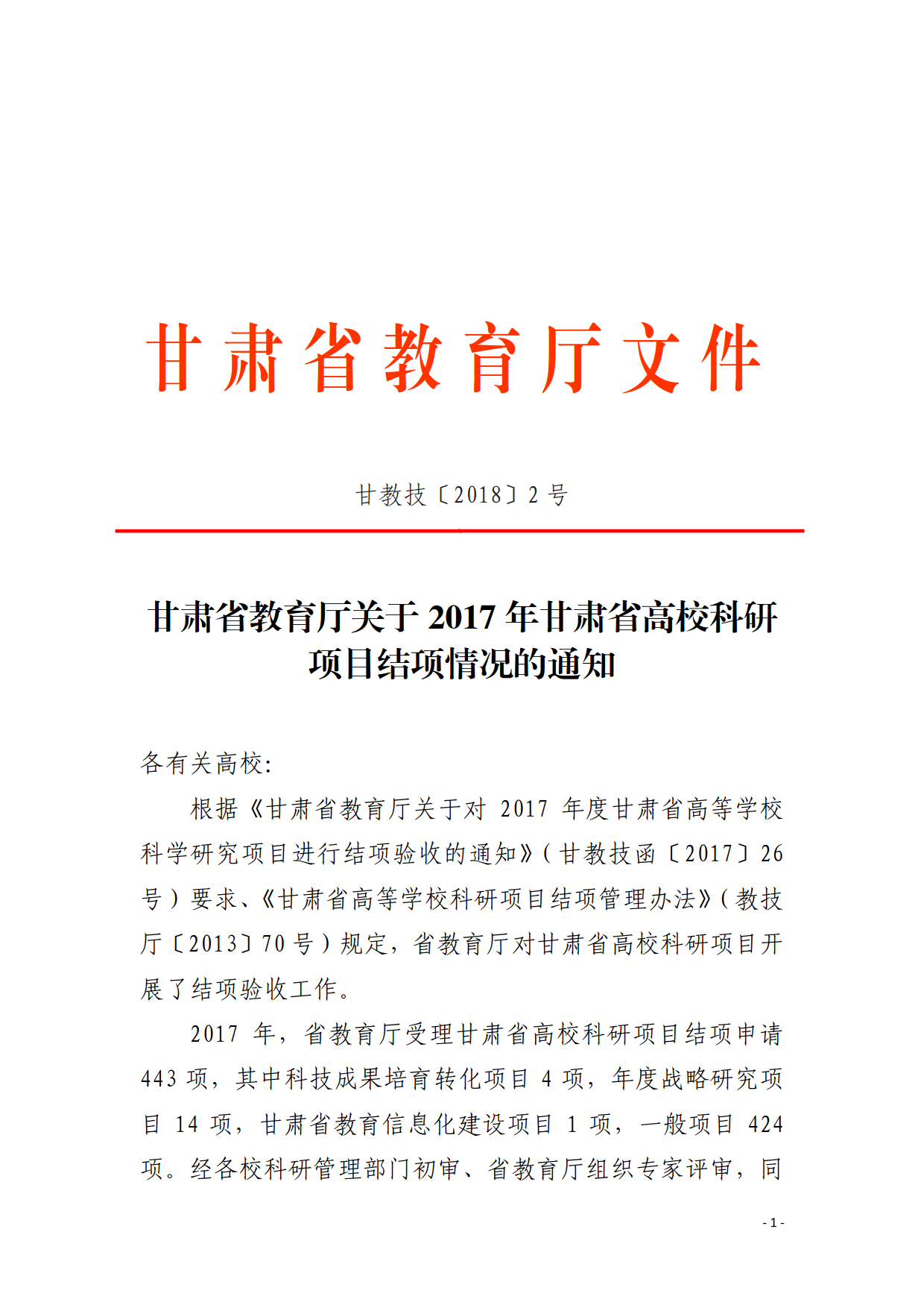 甘肅省教育廳關(guān)于2017年甘肅省高??蒲许?xiàng)目結(jié)項(xiàng)情況的通知