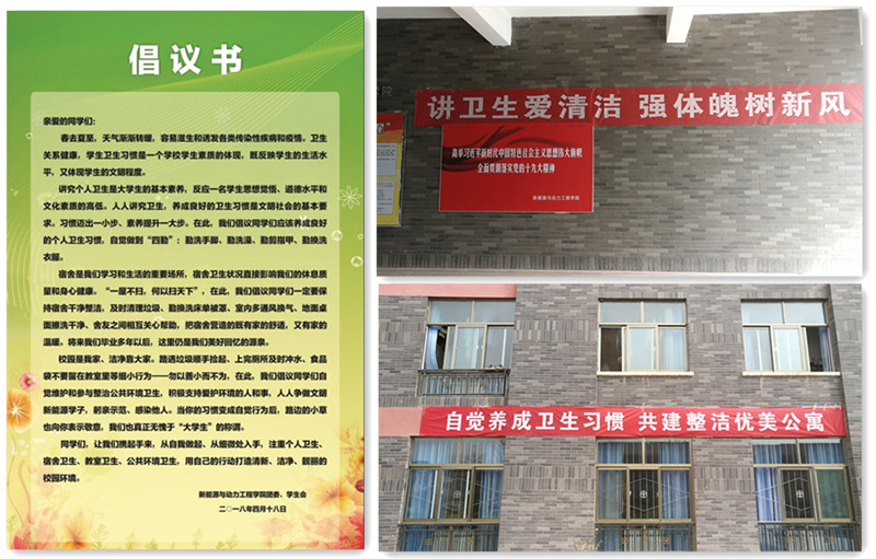 學(xué)院面向全體同學(xué)發(fā)出倡議,并在教學(xué)樓、公寓樓粘貼了倡議書,倡議全體同學(xué)養(yǎng)成良好的個人衛(wèi)生習(xí)慣,自覺做到“四勤”:勤洗手腳、勤洗澡、勤剪指甲、勤換洗衣服;保持宿舍干凈整潔,及時清理垃圾、勤換洗床單被罩、室內(nèi)多通風(fēng)換氣、地面桌面擦洗干凈、舍友之間相互關(guān)心幫助,把宿舍營造得既有家的舒適,又有家的溫暖;自覺維護和參與整治公共環(huán)境衛(wèi)生,從路遇垃圾順手撿起、上完廁所及時沖水、食品袋不要留在教室里等細小行為入手,躬親示范、感染他人,用自己的行動打造清新、潔凈、靚麗的校園環(huán)境,無愧于“大學(xué)生”的稱謂。學(xué)院還在教學(xué)樓和公寓樓分別懸掛了“講衛(wèi)生愛清潔強體魄樹新風(fēng)”、“自覺養(yǎng)成衛(wèi)生習(xí)慣 共建整潔優(yōu)美公寓”等內(nèi)容的宣傳條幅。
