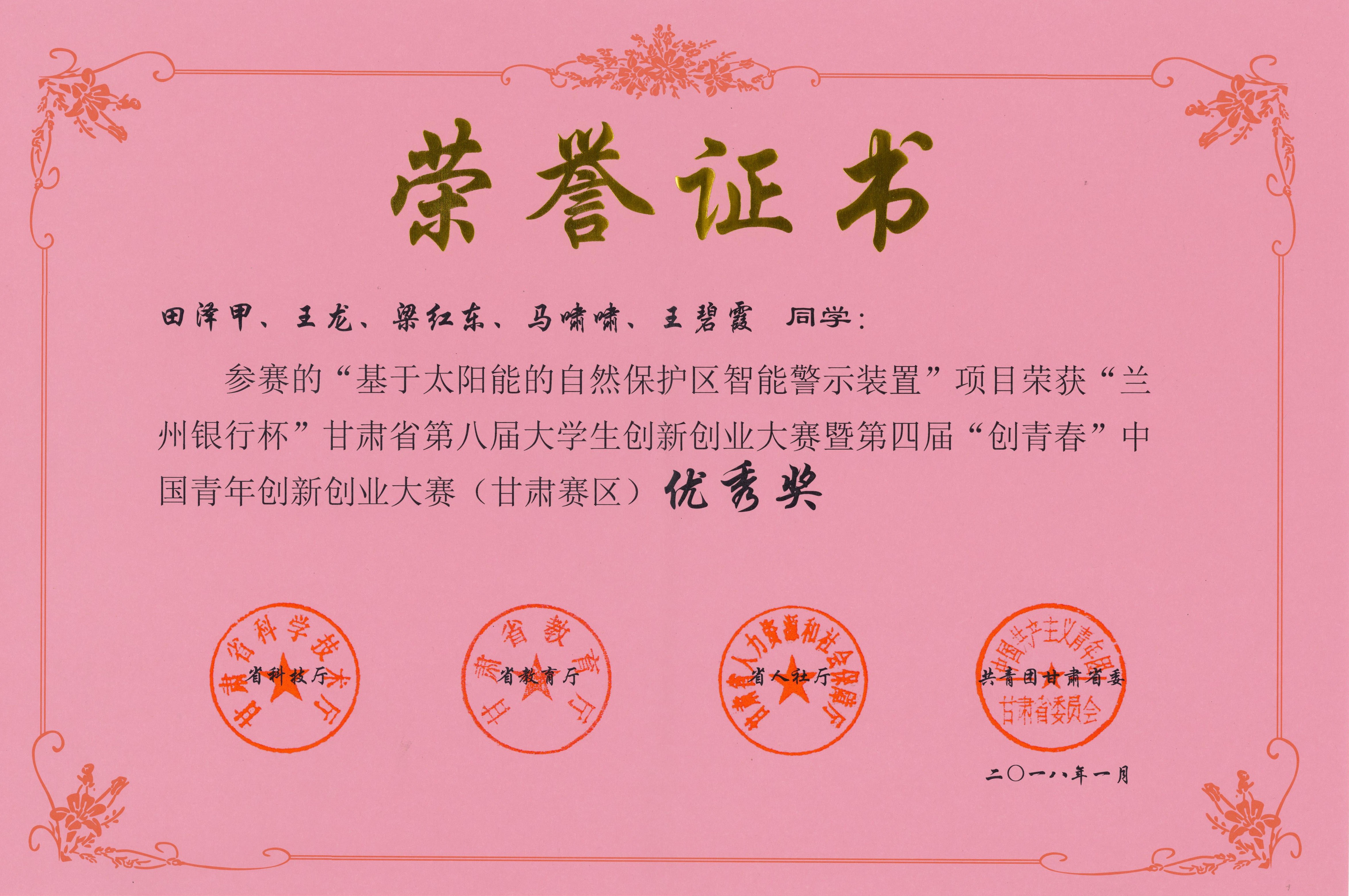 近日,從省教育廳、省科技廳、省人力資源和社會保障廳、共青團甘肅省委聯(lián)合下發(fā)的《關(guān)于公布“蘭州銀行杯”甘肅省第八屆大學生創(chuàng)新創(chuàng)業(yè)大賽暨第四屆“創(chuàng)青春”中國青年創(chuàng)新創(chuàng)業(yè)大賽(甘肅賽區(qū))獲獎名單的通知》中獲知,在今年1月7日舉辦的“蘭州銀行杯”甘肅省第八屆大學生創(chuàng)新創(chuàng)業(yè)大賽暨第四屆“創(chuàng)青春”中國青年創(chuàng)新創(chuàng)業(yè)大賽(甘肅賽區(qū))中,我院選送的“基于太陽能的自然保護區(qū)智能警示裝置”項目獲得優(yōu)秀獎。