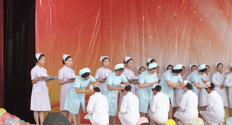 在慶祝活動中,2015級畢業(yè)生代表進行“心肺復蘇技術(shù)”及“右踝關(guān)節(jié)扭傷包扎技術(shù)”表演, 舉行了文藝演出,向全體觀眾展示了護理系學生的精神風貌與才藝。