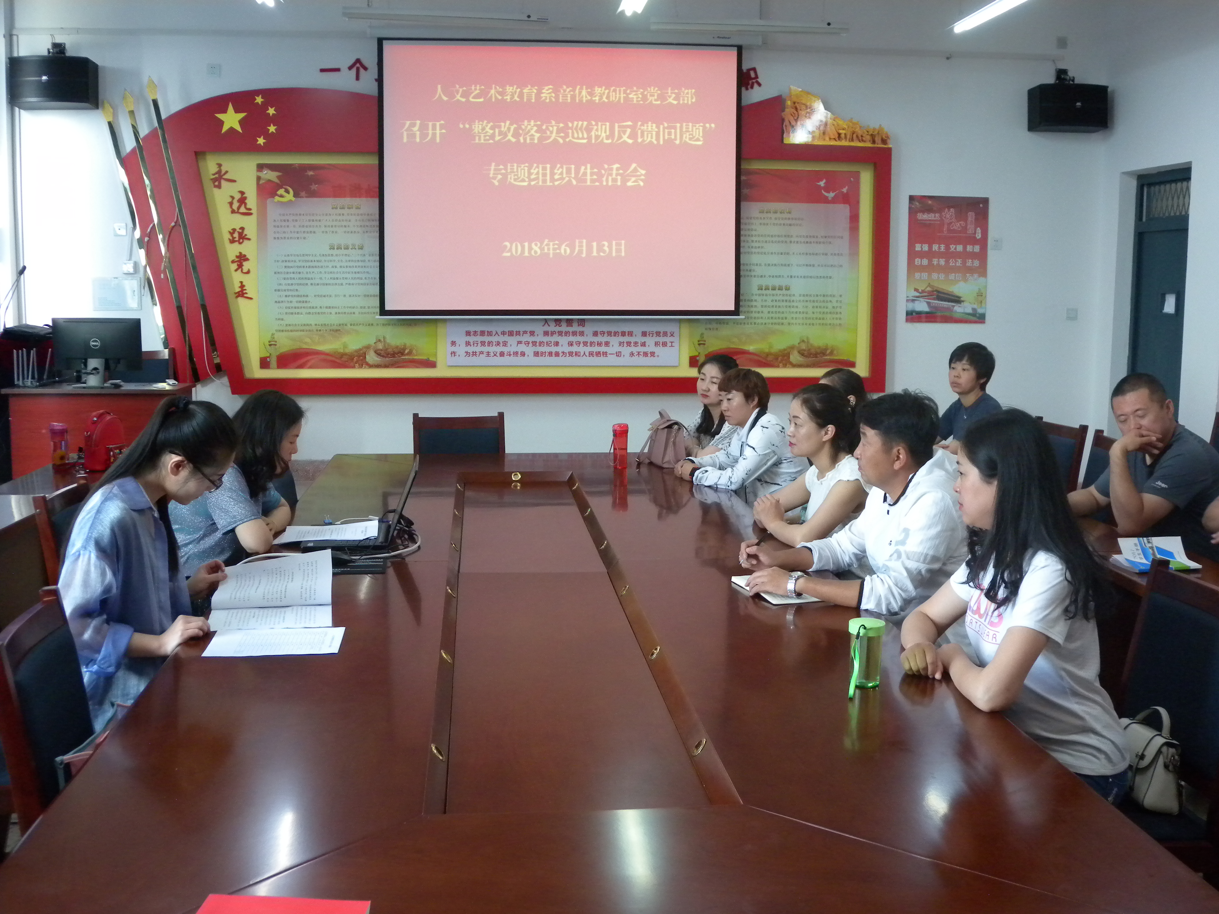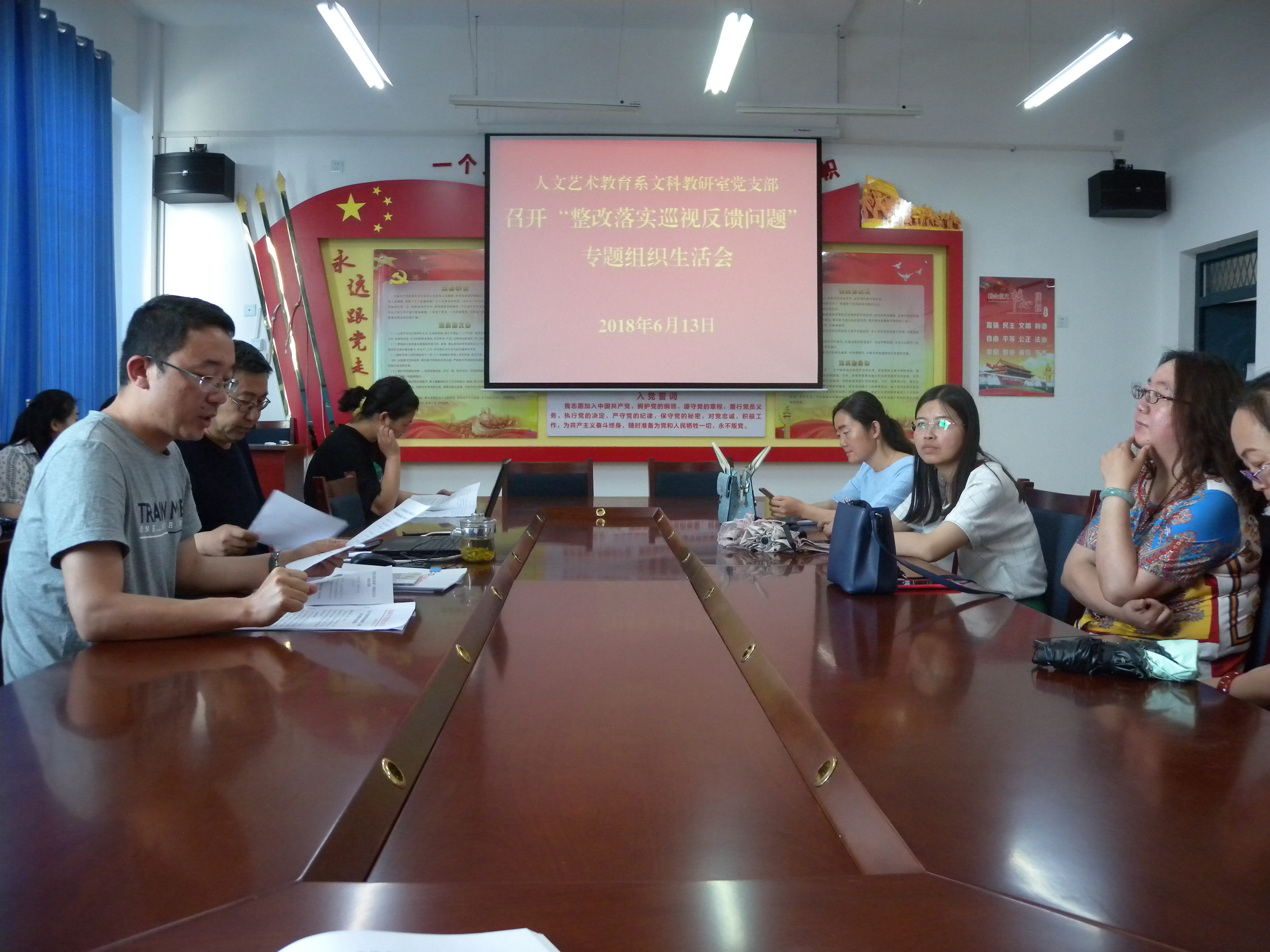 根據(jù)學(xué)院《關(guān)于以“整改落實(shí)巡視反饋問(wèn)題”為主題召開專題組織生活會(huì)的通知》(武職院組函〔2018〕35號(hào))精神,6月13日,人文藝術(shù)教育系黨總支文科教研室黨支部和音體教研室黨支部在勵(lì)勤樓209黨員活動(dòng)室分別召開了以“整改落實(shí)巡視反饋問(wèn)題”為主題的組織生活會(huì)。會(huì)議分別由支部書記主持,黨支部全體黨員參加。