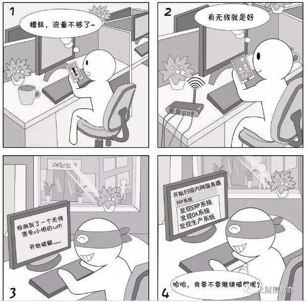 無線路由器有較多的安全隱患,比如之前的wep認(rèn)證能很輕易破解。個(gè)人架設(shè)無線路由器,如果配置不當(dāng),家用最多導(dǎo)致蹭網(wǎng)或個(gè)人資料泄露,但在單位使用可能會導(dǎo)致內(nèi)網(wǎng)被入侵,單位機(jī)密、客戶資料泄密,后果不堪設(shè)想。