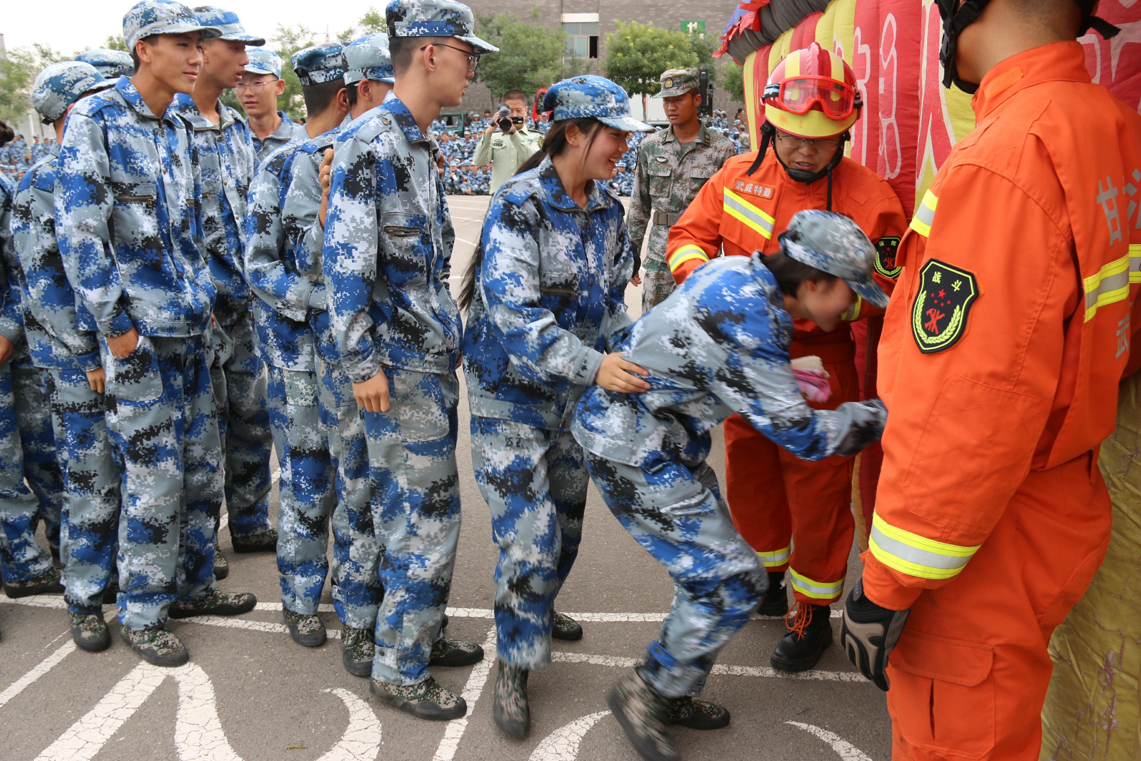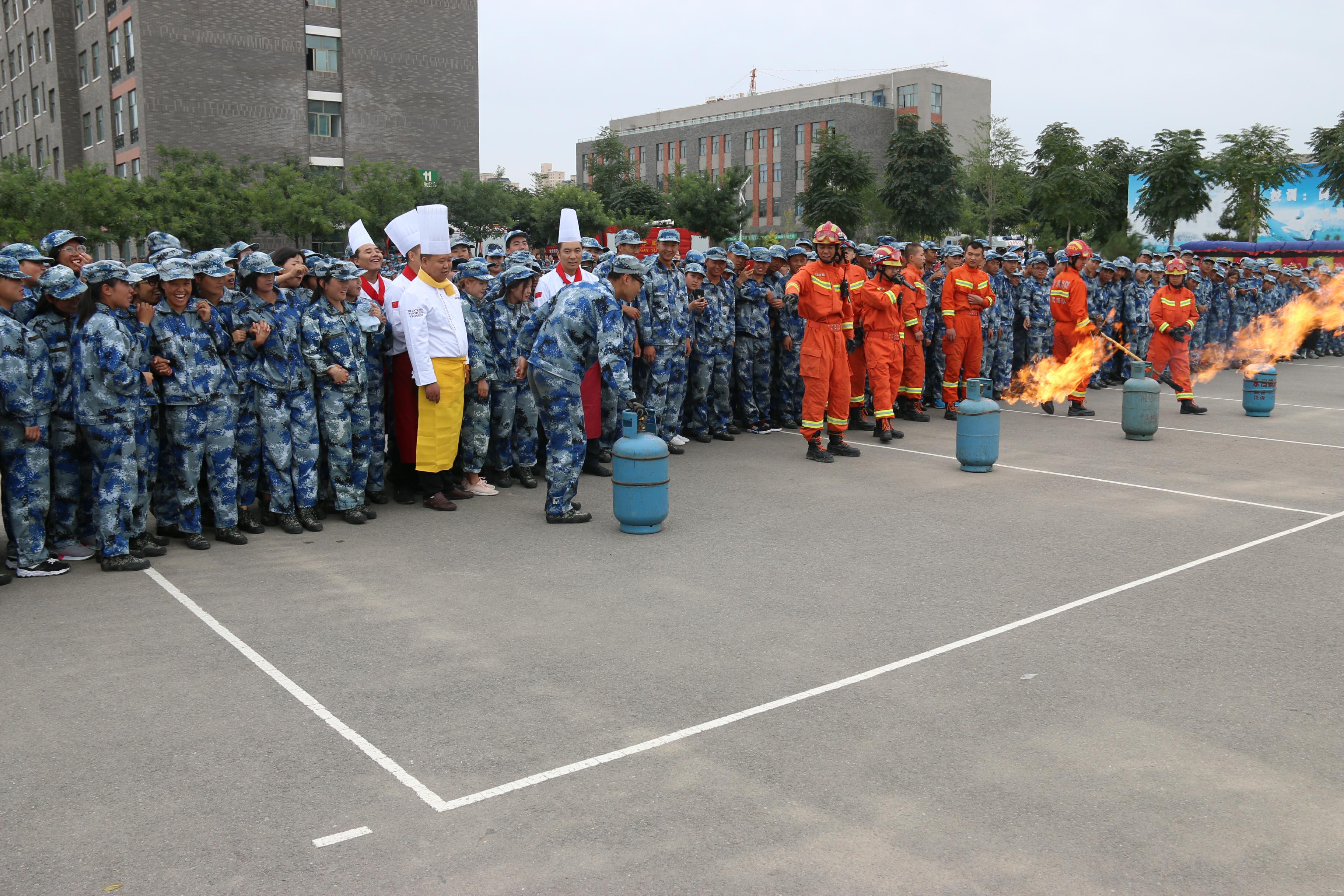 隨后,所有參演學(xué)生整隊(duì)到操場(chǎng)參加了滅火演練。在消防官兵的講解和和示范下,同學(xué)們體驗(yàn)了處置著火液化氣瓶、干粉滅火器滅火、穿消防救生衣、通過(guò)模擬煙室等操作。