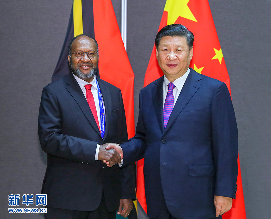 11月16日,國家主席習(xí)近平在莫爾茲比港分別會見建交太平洋島國領(lǐng)導(dǎo)人。這是習(xí)近平會見紐??偫硭?新華社記者 丁林 攝