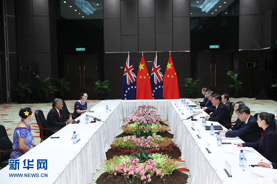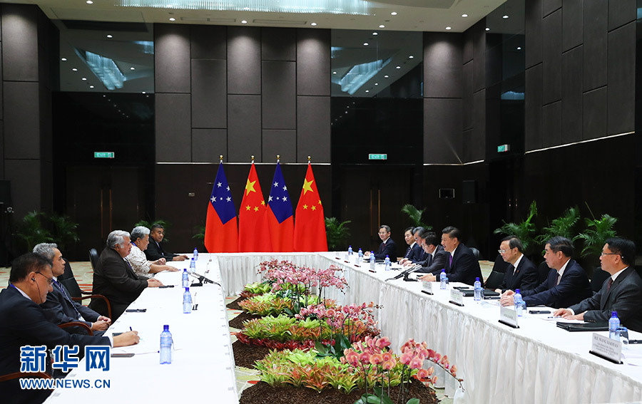 11月16日,國家主席習(xí)近平在莫爾茲比港分別會見建交太平洋島國領(lǐng)導(dǎo)人。這是習(xí)近平會見薩摩亞總理圖伊拉埃帕。 新華社記者 謝環(huán)馳 攝