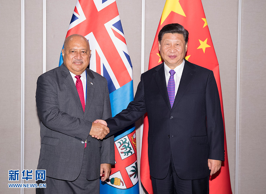 11月16日,國家主席習(xí)近平在莫爾茲比港會見斐濟(jì)政府代表、國防部長昆布安博拉。 新華社記者 黃敬文 攝