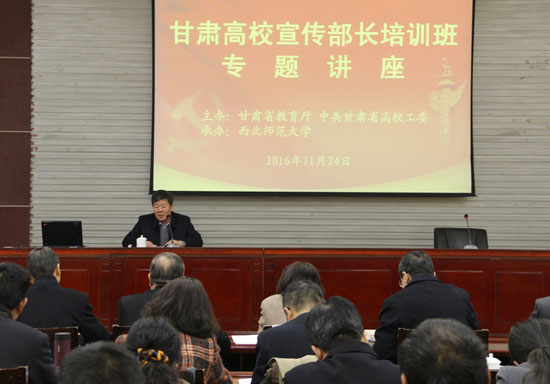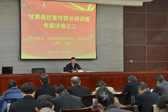 王嘉毅在專題講座中介紹了甘肅高等教育現狀、存在問題和“十三五”發(fā)展目標。他指出,高校宣傳思想工作主要任務要把學習貫徹落實黨的十八大以來的重大部署,特別是六中全會精神和習近平總書記系列重要講話精神作為重要任務來抓;要把貫徹落實中宣部、教育部黨組《關于加強和改進高校宣傳思想工作隊伍建設的意見》精神和省委辦公廳、省政府辦公廳《關于進一步加強和改進新形勢下高校宣傳思想工作的實施意見》作為重要任務來抓;要把進一步弘揚社會主義核心價值觀、加強正面宣傳、傳播正能量作為重要任務來抓。通過準確把握新形勢下高校宣傳思想工作的動態(tài),分析研判我省高校宣傳思想工作面臨的問題,切實加強高校意識形態(tài)領域的工作,提升網絡輿情掌控應對能力,積極開展馬克思主義研究,全面繁榮哲學社會科學,提高覺悟,凝聚共識,強化措施,全面推動高校宣傳思想工作質量提升和創(chuàng)新發(fā)展。