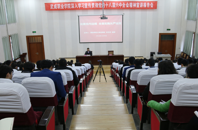 為全面準(zhǔn)確學(xué)習(xí)宣傳黨的十八屆六中全會精神,12月9日上午,學(xué)院在尚德樓正德廳舉辦“深入學(xué)習(xí)宣傳貫徹黨的十八屆六中全會精神宣講報(bào)告會”,邀請西北師范大學(xué)教授李玉璧作題為《完善黨內(nèi)法規(guī) 全面實(shí)施從嚴(yán)治黨》的宣講報(bào)告。學(xué)院副院長王永緒、潘玉華、田迎春,中層干部及師生代表200余人參加報(bào)告會。田迎春主持宣講報(bào)告會。