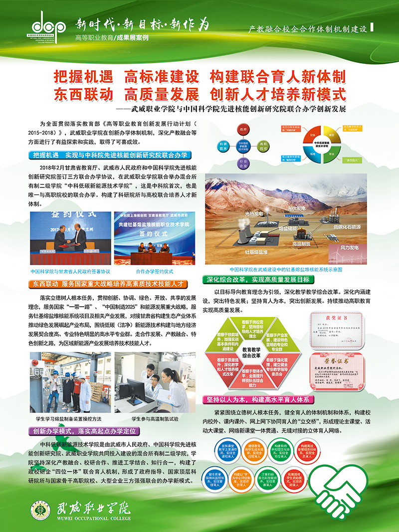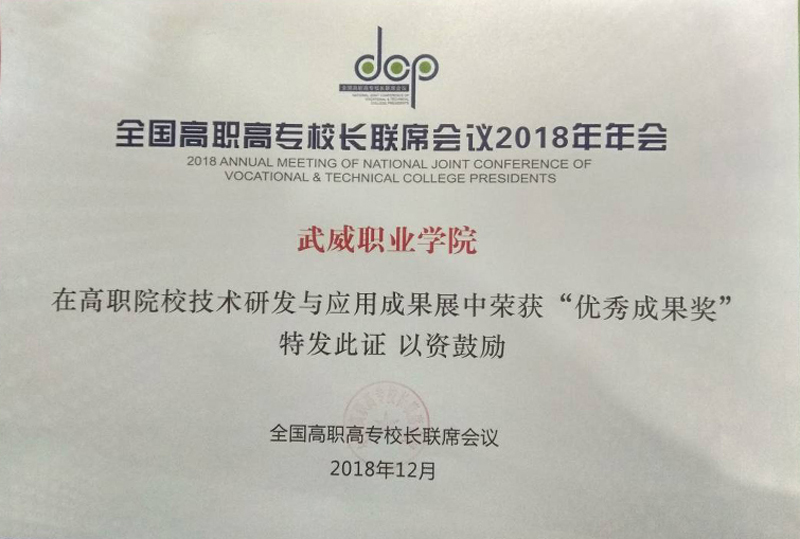 12月8日至9日,學(xué)院黨委書記、院長(zhǎng)趙明教授、副院長(zhǎng)翟存祥教授帶隊(duì)參加了在福建福州召開的全國高職高專校長(zhǎng)聯(lián)席會(huì)議2018年年會(huì)。學(xué)院自主研發(fā)的“光伏組件智能清潔裝置”榮獲高職院校技術(shù)研發(fā)與應(yīng)用成果 “優(yōu)秀成果獎(jiǎng)”(全國僅36所高職院校獲此殊榮,甘肅省僅2所),“學(xué)院與中科院先進(jìn)核能創(chuàng)新研究院聯(lián)合辦學(xué)創(chuàng)新發(fā)展”案例入選教育成果案例展。