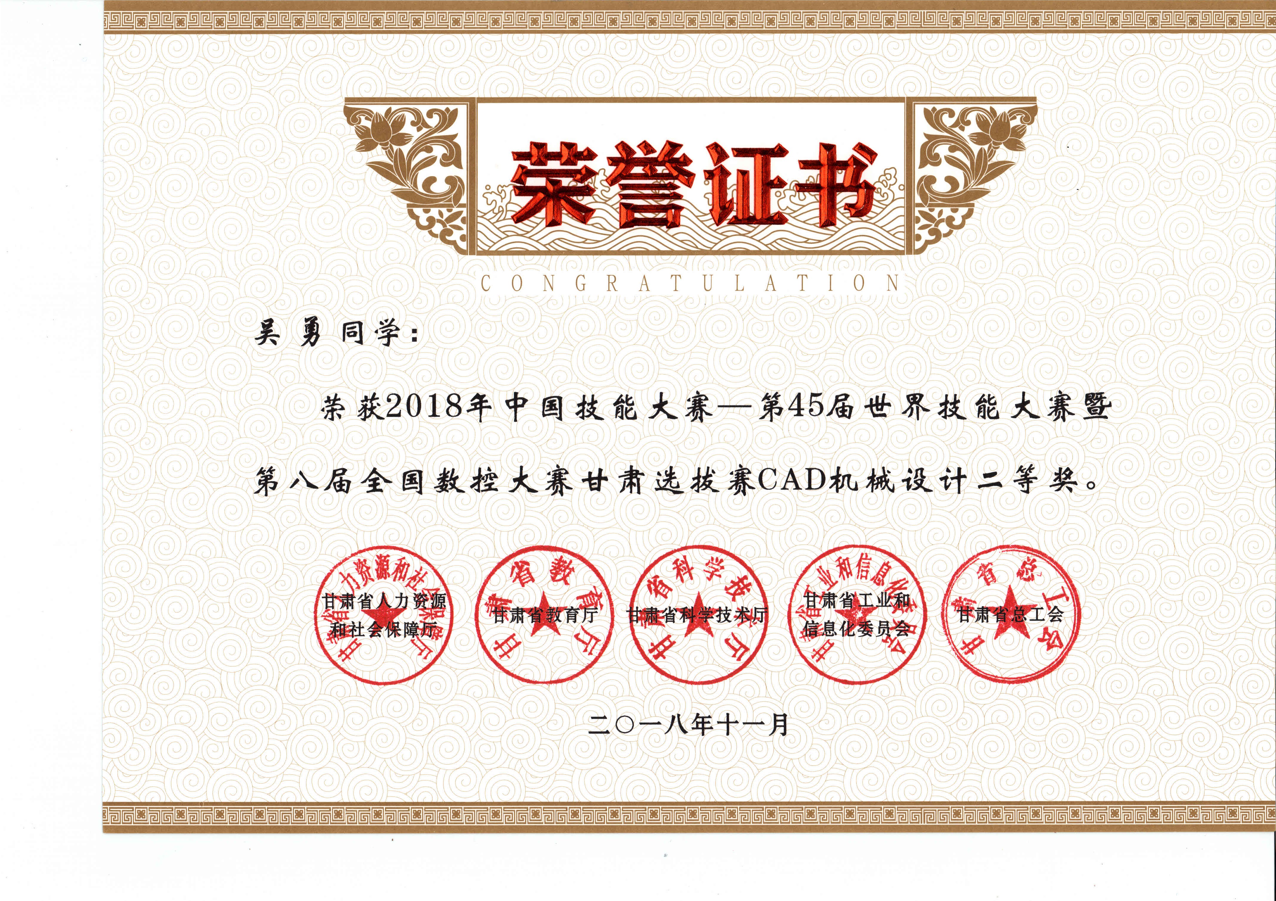 2018年中國技能大賽--第45屆世界技能大賽暨第八屆全國數(shù)控大賽甘肅選拔賽(CAD機(jī)械設(shè)計項目)獲獎證書