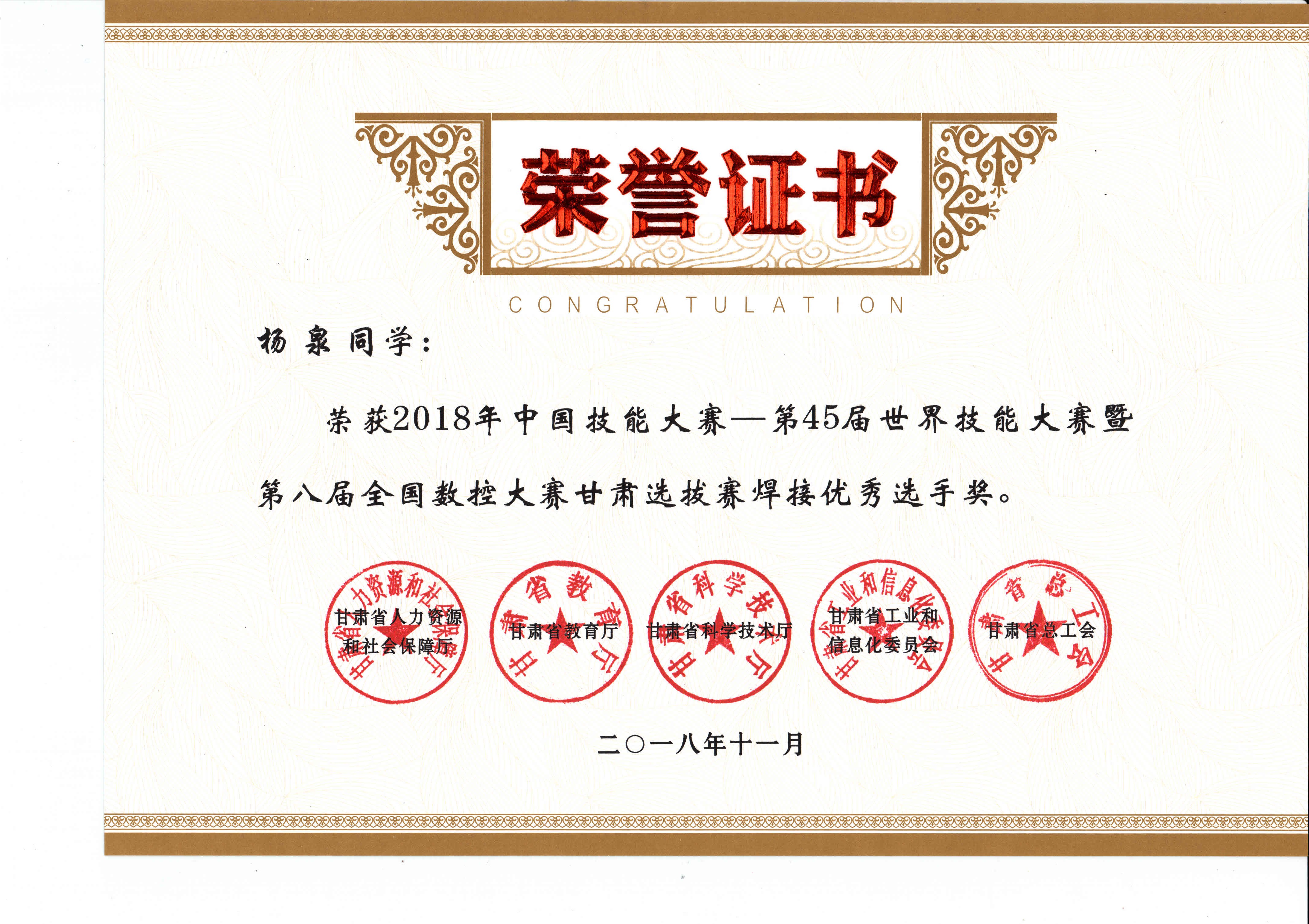 2018年中國技能大賽--第45屆世界技能大賽暨第八屆全國數(shù)控大賽甘肅選拔賽(焊接項目)獲獎證書