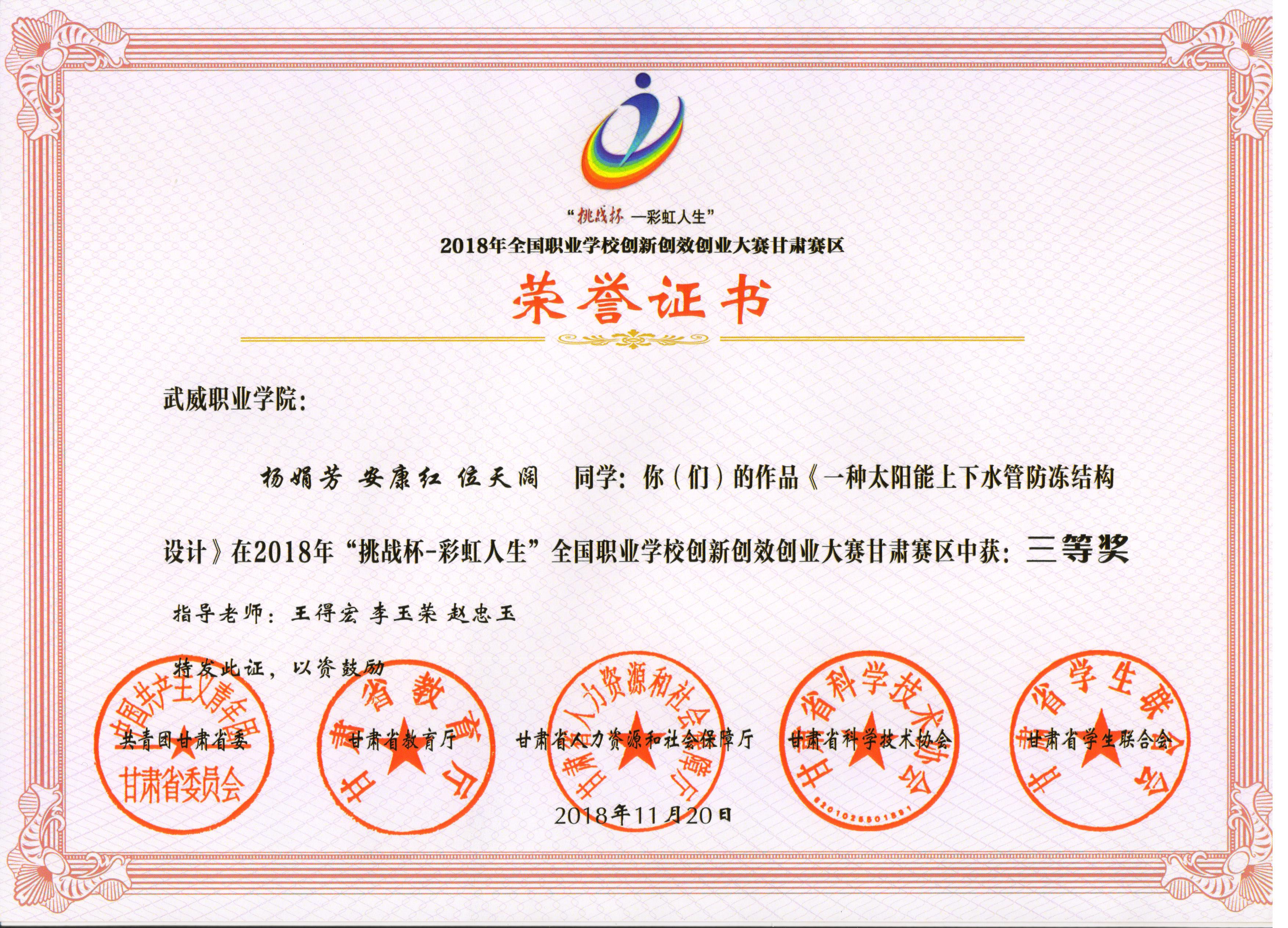 2018年“挑戰(zhàn)杯--彩虹人生”全國(guó)職業(yè)學(xué)校創(chuàng)新創(chuàng)效創(chuàng)業(yè)大賽甘肅賽區(qū)三等獎(jiǎng)