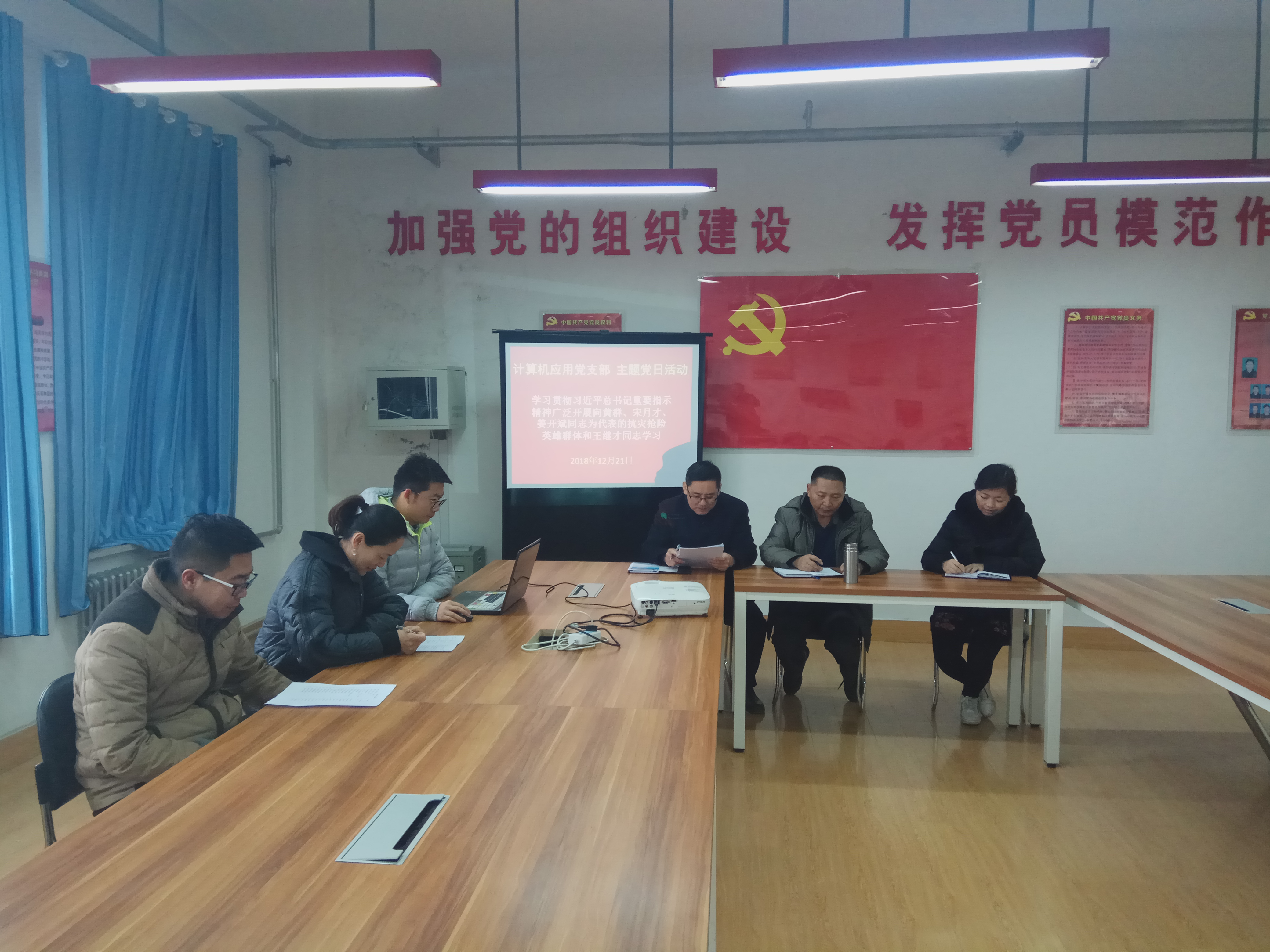 2018年12月21日,電子及網(wǎng)絡(luò)黨支部組織開展“不忘初心、牢記使命——學(xué)習(xí)全國、全省優(yōu)秀共產(chǎn)黨員先進(jìn)事跡”主題黨日活動(dòng),電子及網(wǎng)絡(luò)黨支部全體黨員參加學(xué)習(xí)。