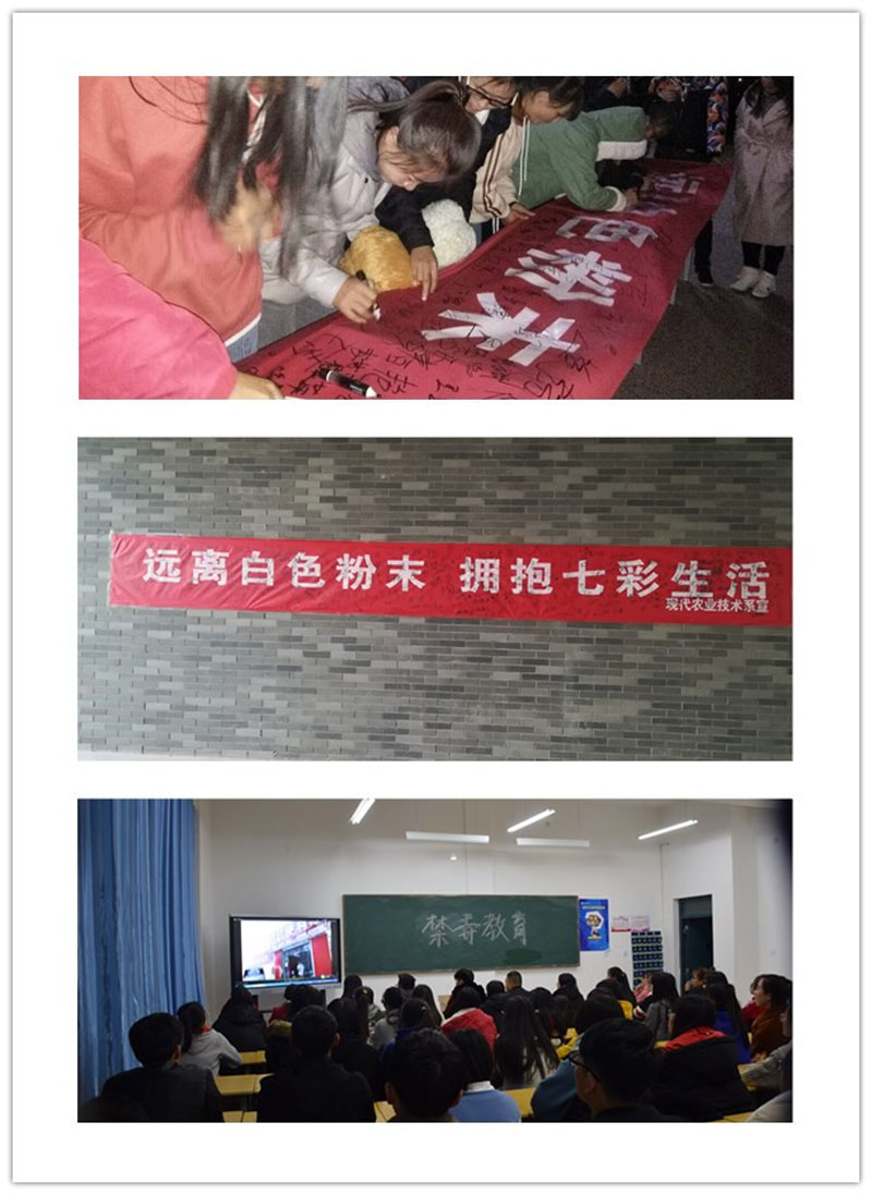 現(xiàn)代農(nóng)業(yè)技術(shù)系結(jié)合自身實際和條件,重點開展了以下活動。一是通過在行樹樓張貼“遠離白色粉末擁抱七彩生活”禁毒橫幅,號召全系師生創(chuàng)建和諧、文明、無毒的校園環(huán)境;二是各班開展了禁毒宣傳主題班會,宣傳毒品危害,普及防毒知識,警示大家珍愛生命,遠離毒品;三是組織學生參加學院禁毒征文大賽,用語言表達禁毒的決心;四是團學會組織各班同學網(wǎng)上參觀“中國禁毒數(shù)字展覽館”,觀看禁毒題材的優(yōu)秀微電影《一路有你》、《少年的秘密》、《蛻變》、《愛心帶你回家》,讓在場同學深刻感受到毒品的危害,堅定了同學們禁毒防毒的信心。