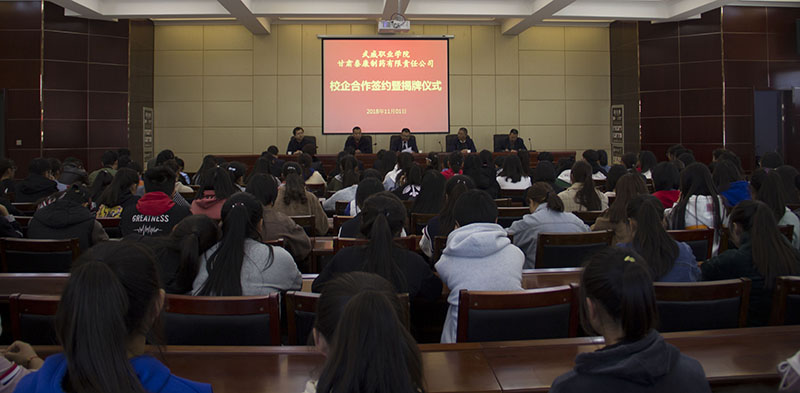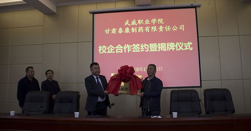 為提高人才培養(yǎng)質(zhì)量和辦學(xué)水平,加強(qiáng)校企協(xié)同育人機(jī)制建設(shè),11月1日下午,藥學(xué)系與甘肅泰康制藥有限責(zé)任公司校企合作共建“就業(yè)實習(xí)基地”簽約揭牌儀式在行樹樓北側(cè)會議室隆重舉行。甘肅泰康制藥有限責(zé)任公司投資方—北京久朝集團(tuán)產(chǎn)業(yè)中心總監(jiān)楊宏超、公司總工程師毛著鴻、財務(wù)總監(jiān)郝敏等企業(yè)領(lǐng)導(dǎo)出席本次儀式。學(xué)院教務(wù)處處長仲生仁、招生就業(yè)處處長蔡柱山、藥學(xué)系主任魏潤明、副主任楊建美、黨總支副書記單光年及藥學(xué)系160余名師生參加了此次簽約揭牌儀式。儀式由魏潤明主持。
