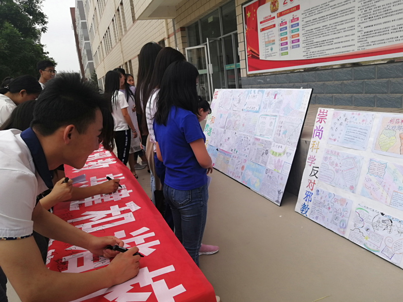 先后舉行“崇尚科學,反對邪教,共建和諧校園”簽名活動、開展“崇尚科學,反對邪教”主題班會。班會課上,老師為學生講解什么是邪教組織以及邪教的危害,培養(yǎng)學生的理性思維,樹立正確的世界觀、人生觀、價值觀,用科學的精神自覺抵制邪教。并通過黑板報,張貼反邪教手抄報等多種活動形式,讓師生對邪教危害性有進一步地了解,提高全社會反邪教、樹正氣的意識。以自己的實際行動,積極倡導、傳播科學思想,普及科學知識,弘揚科學精神,用科學的方法辦事,以科學的態(tài)度對待事物,共同促進校園和諧發(fā)展,提高了師生認識和抵制邪教的意識與能力。