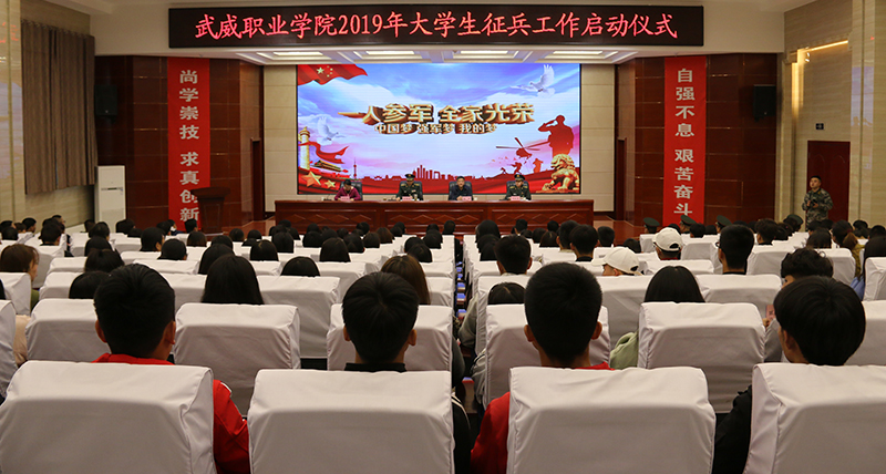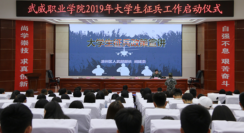 5月9日下午,學(xué)院2019年大學(xué)生征兵工作啟動儀式在大學(xué)生活動中心菁英廳舉行。武威軍分區(qū)司令員、市征兵領(lǐng)導(dǎo)小組副組長張國輝大校,涼州區(qū)人武部部長、涼州區(qū)征兵領(lǐng)導(dǎo)小組副組長兼征兵辦公室主任闞延貴上校,學(xué)院黨委書記、院長趙明,副院長田迎春,武威軍分區(qū)動員處、涼州區(qū)人武部干部,學(xué)院各系黨總支書記、輔導(dǎo)員及學(xué)生代表共計(jì)220余人參加了會議。會議由田迎春主持。