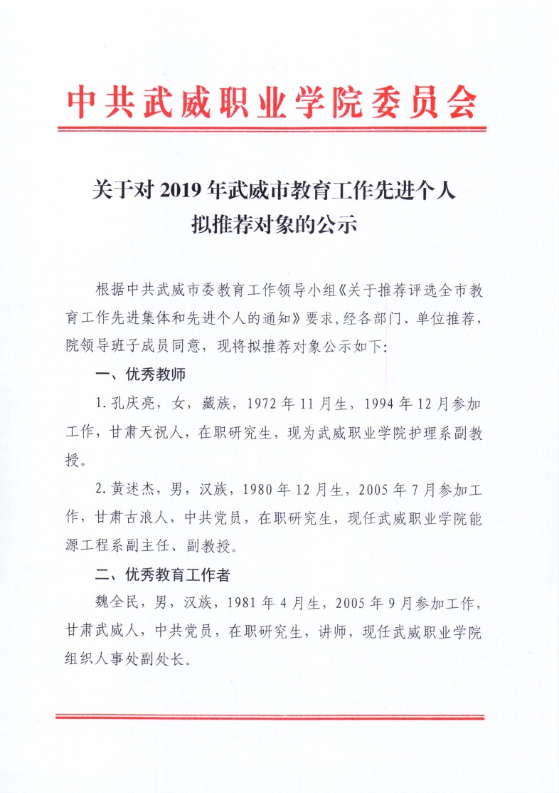 關(guān)于對2019年武威市教育工作先進個人擬推薦對象的公示