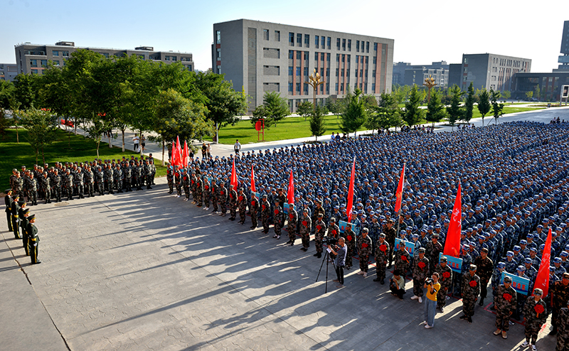 9月4日上午,學(xué)院2019級(jí)新生軍訓(xùn)動(dòng)員大會(huì)暨大學(xué)生應(yīng)征入伍歡送儀式在大學(xué)生活動(dòng)中心廣場(chǎng)舉行。學(xué)院黨委書(shū)記、院長(zhǎng)趙明出席并向軍訓(xùn)團(tuán)授旗,黨委副書(shū)記翟存祥寄語(yǔ)全體新生,院領(lǐng)導(dǎo)張富國(guó)、王永緒、田迎春、何毅、張開(kāi)禮及31666部隊(duì)營(yíng)長(zhǎng)李明出席,承訓(xùn)單位55名教官,學(xué)院各系黨總支書(shū)記、輔導(dǎo)員、新生班班主任,2019年參軍入伍的28名大學(xué)生、2019級(jí)4157名學(xué)生參加了大會(huì)。大會(huì)由副院長(zhǎng)王守云主持。