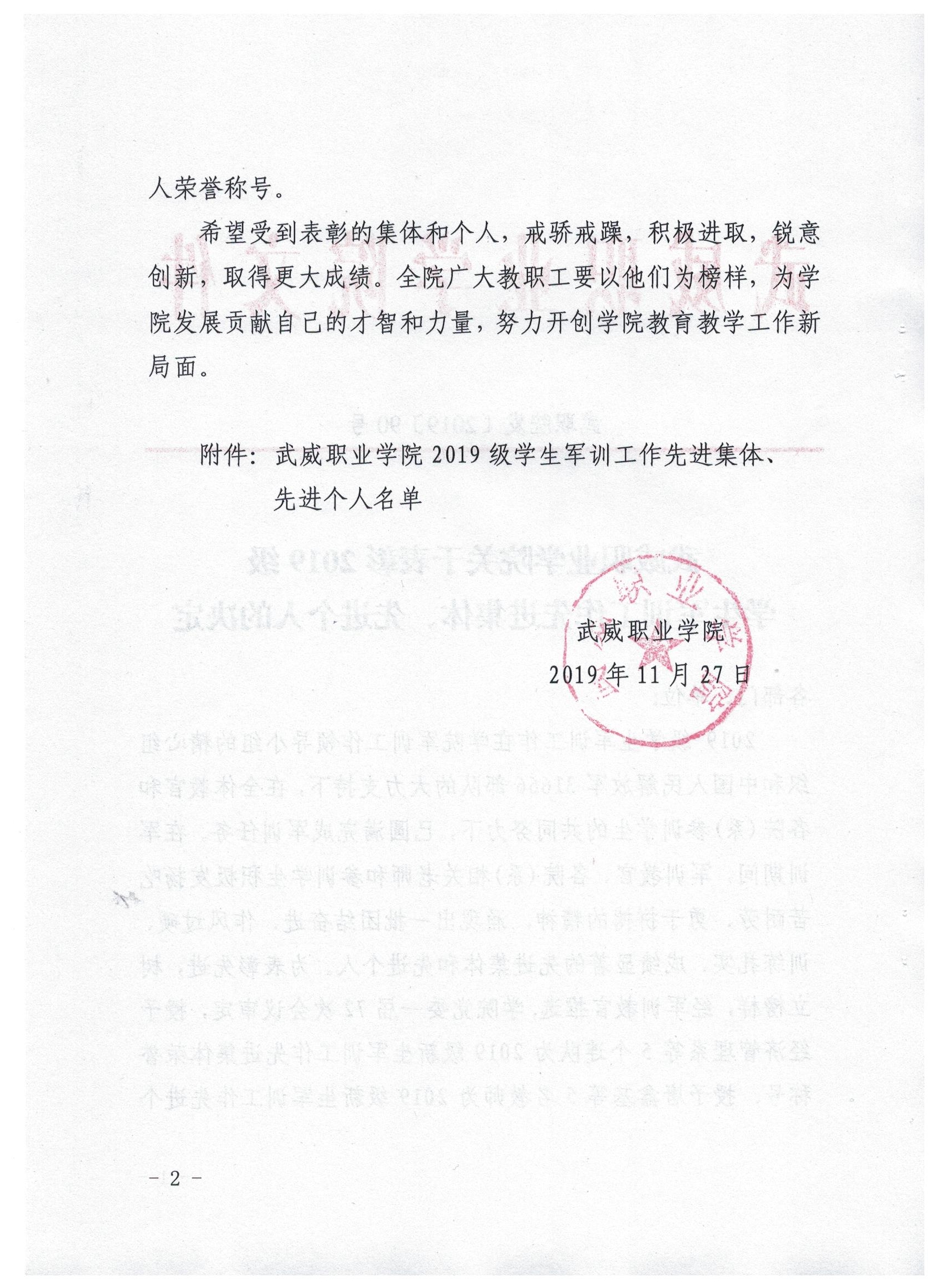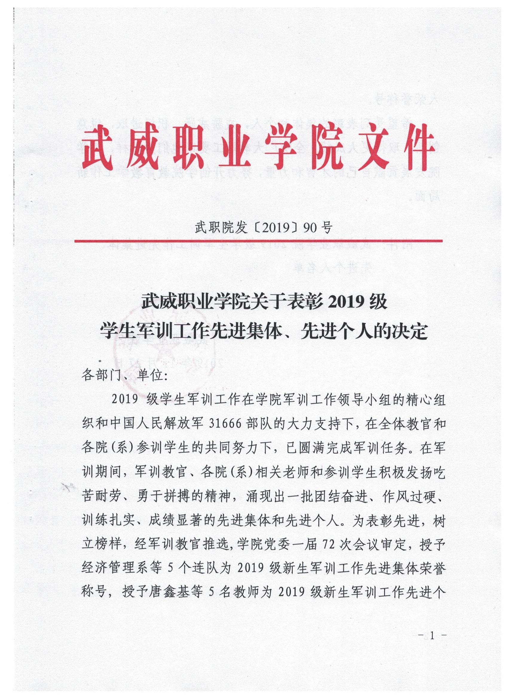 武威職業(yè)學(xué)院關(guān)于表彰2019級學(xué)生軍訓(xùn)工作先進(jìn)集體、先進(jìn)個(gè)人的決定
