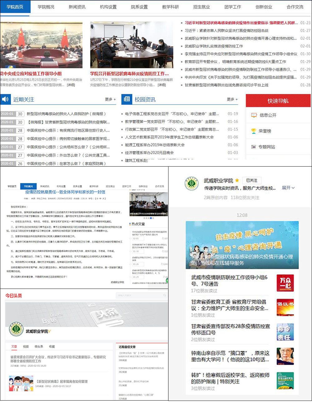 學院通過網(wǎng)站、微信公眾號、隴政釘、微信群、QQ群等平臺,第一時間刊載轉(zhuǎn)發(fā)習近平總書記重要指示、李克強總理批示,中共中央、教育部、省委、省教育工委、武威市委關(guān)于做好新型冠狀病毒感染肺炎疫情防控工作的重要會議、文件、通知以及《武威職業(yè)學院致全體同學和家長的一封信》《中共武威職業(yè)學院委員會致學院各基層黨組織和廣大共產(chǎn)黨員的倡議書》和防控知識50多條;做到宣傳教育和正面引導覆蓋到每一位教師、每一個班級、每一位學生,確保師生和學生家長及時了解疫情發(fā)展態(tài)勢、臨床癥狀和學習掌握防控知識;做到科學認識、理性判斷、合理應對,不信謠、不傳謠,養(yǎng)成健康的防控生活習慣,堅定信心、眾志成城防控疫情、戰(zhàn)勝疫情。