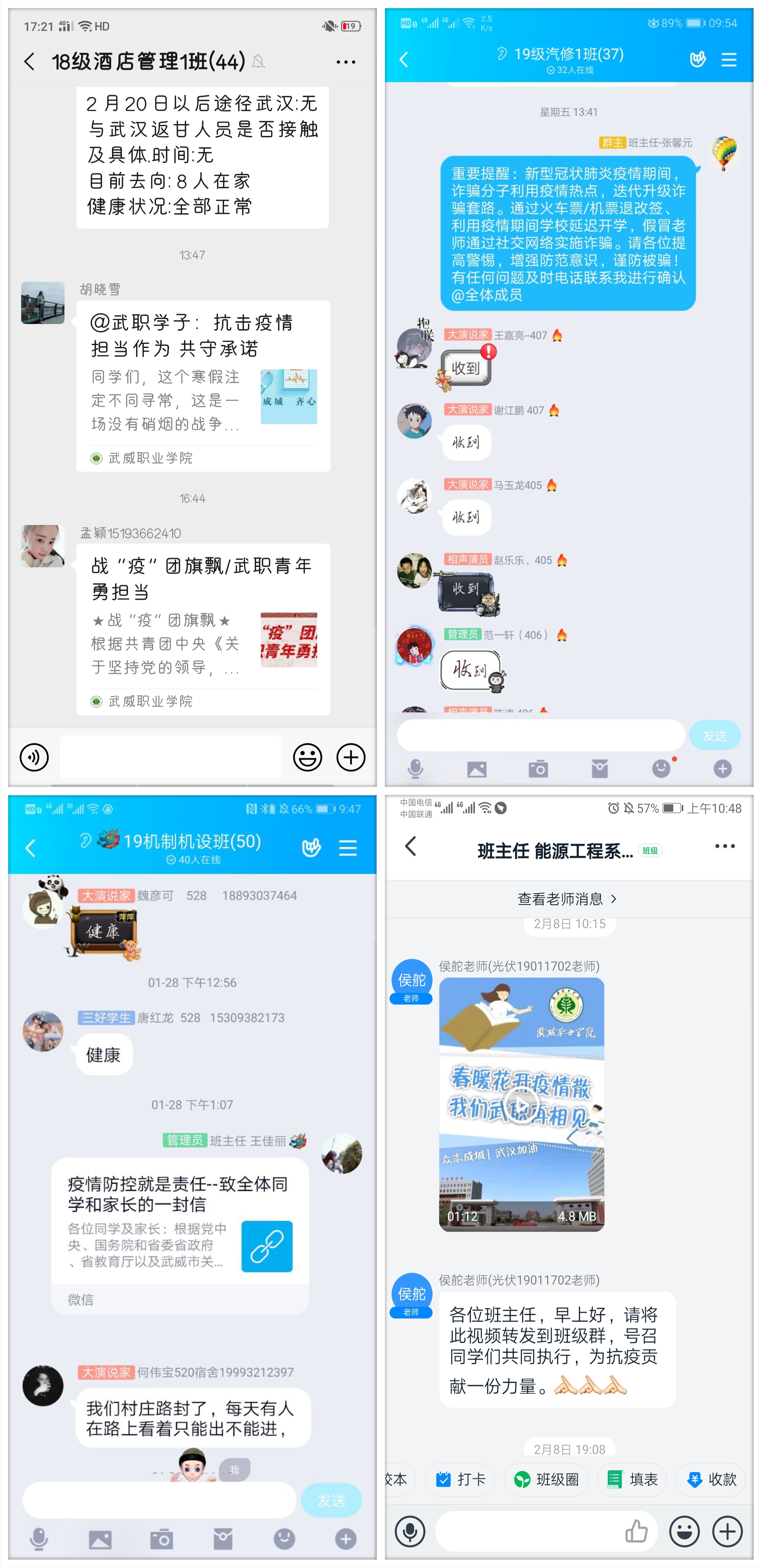 學(xué)生工作處及時發(fā)布了致學(xué)生和家長的一封信《疫情防控就是責(zé)任》,團(tuán)委制作和推送了《春暖花開疫情散 我們武職再相見》溫馨提示短片和《@武職學(xué)子:抗擊疫情 擔(dān)當(dāng)作為 共守承諾》倡議,用生動形象的表述要求和提醒同學(xué)們不得提前返校,做好個人防護(hù)措施,遵守當(dāng)?shù)匾咔榉揽馗黜椧?,做到不信謠不傳謠,及時向?qū)W院報送個人防疫相關(guān)信息,不瞞報不慌報。各院系輔導(dǎo)員和班主任都會第一時間在學(xué)生群里轉(zhuǎn)發(fā),同時把學(xué)院網(wǎng)站和微信平臺上科學(xué)的防控知識和上級的有關(guān)精神及時傳達(dá)給學(xué)生,當(dāng)好疫情防控的宣傳員,做到戰(zhàn)疫有“力”。