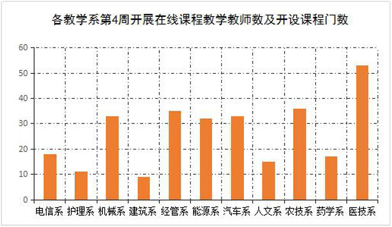 第4周,各教學(xué)系在線課程按照教學(xué)安排全部上線運行,實際開課315門,較第1-2周(284門次)有所增加。在線課程達到“應(yīng)開盡開”的目標,全部在線課程整體運行平穩(wěn)有序。本周授課總學(xué)時達到1681學(xué)時,教師參加在線授課共計1631人次。