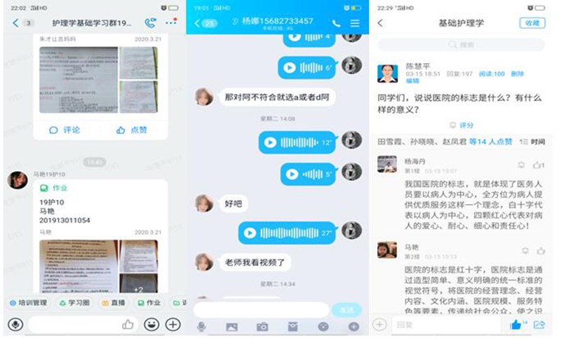 護理系通過“多平臺、多渠道”全面開展在線教學(xué),主要采取“網(wǎng)絡(luò)課程+資料推送+討論答疑+互動直播”的線上教學(xué)模式。全系24名教師全部實施線上教學(xué),課程共計11門次,已完成授課544學(xué)時(截至3月22日)。本周教師上傳課程課件93件,上傳視頻269個,根據(jù)教學(xué)任務(wù)布置課堂練習(xí)題數(shù)量為435,布置課后作業(yè)題目數(shù)量為857,本周內(nèi)教師組織開展討論、答疑的總次數(shù)為89次,學(xué)生參與答疑討論的次數(shù)為16874次。學(xué)生平均到課率95%以上。從學(xué)院教學(xué)平臺反饋數(shù)據(jù)看,本周課程訪問量達到399415,位居全院第一。