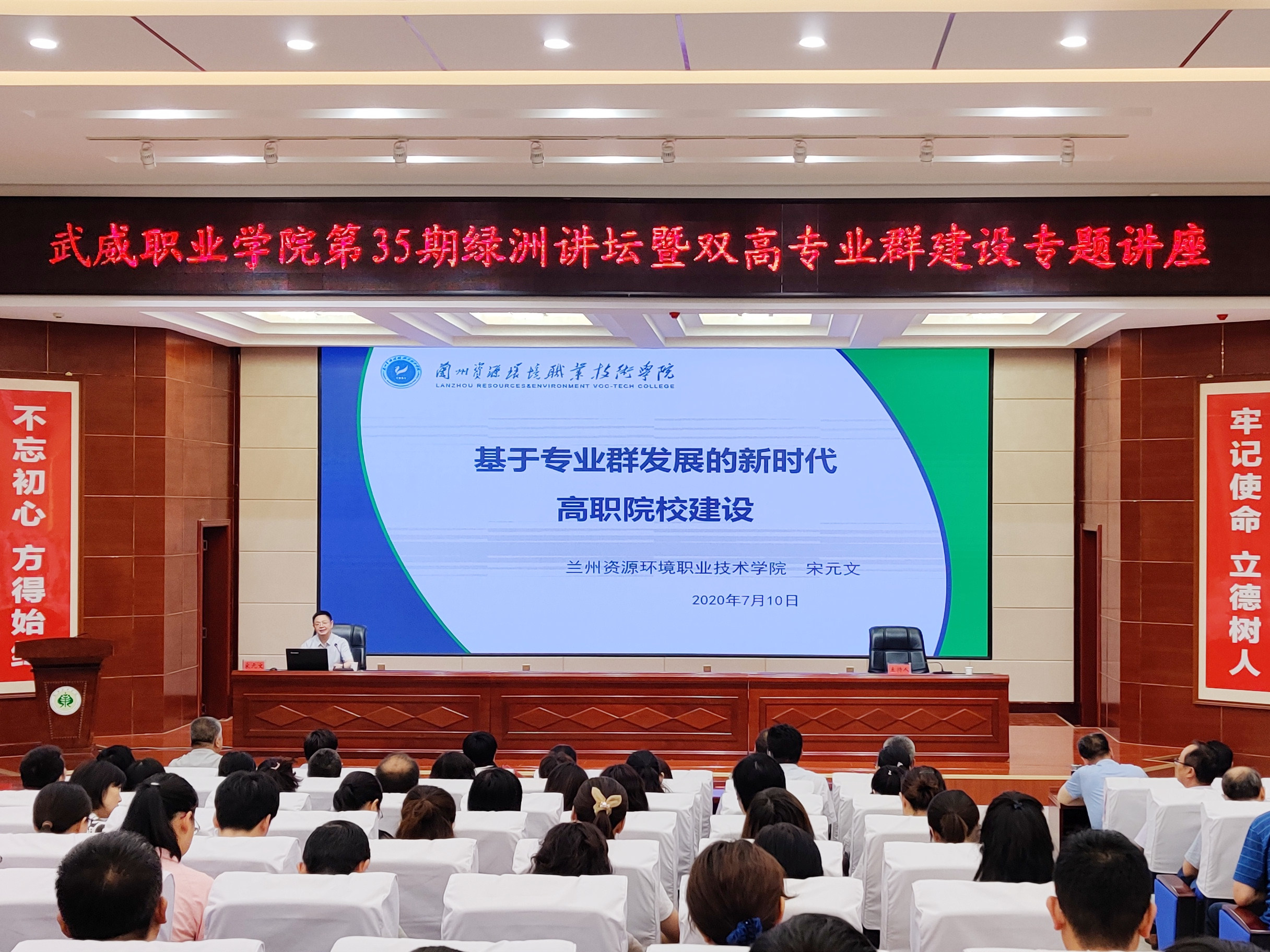 7月11日上午,學(xué)院在大學(xué)生活動(dòng)中心菁英廳舉辦第35期綠洲講壇暨雙高專(zhuān)業(yè)群建設(shè)專(zhuān)題講座。學(xué)院黨委書(shū)記、院長(zhǎng)趙明主持報(bào)告會(huì),黨委副書(shū)記翟存祥,黨委委員、副院長(zhǎng)田迎春、何毅、張開(kāi)禮、王守云,武威職教集團(tuán)成員單位代表,學(xué)院各部門(mén)和教學(xué)院系負(fù)責(zé)人、專(zhuān)業(yè)負(fù)責(zé)人和教師代表共計(jì)200余人參加了報(bào)告會(huì)。圖為蘭州資源環(huán)境職業(yè)技術(shù)學(xué)院黨委委員、副院長(zhǎng)宋元文教授作“基于專(zhuān)業(yè)群發(fā)展的新時(shí)代高職院校建設(shè)”專(zhuān)題報(bào)告。