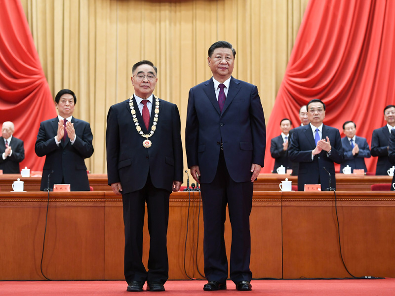 栗戰(zhàn)書宣讀習(xí)近平簽署的中華人民共和國主席令。主席令指出,為了隆重表彰在抗擊新冠肺炎疫情斗爭中作出杰出貢獻(xiàn)的功勛模范人物,弘揚(yáng)他們忠誠、擔(dān)當(dāng)、奉獻(xiàn)的崇高品質(zhì),根據(jù)第十三屆全國人民代表大會常務(wù)委員會第二十一次會議的決定,授予鐘南山“共和國勛章”,授予張伯禮、張定宇、陳薇“人民英雄”國家榮譽(yù)稱號。