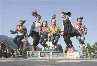 ⑤ 廣西柳州市融水苗族自治縣大年鄉(xiāng)高馬村小學師生一起開展體育活動。