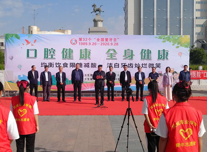2020年9月20日是第32個(gè)“全國(guó)愛(ài)牙日”,為進(jìn)一步普及口腔健康知識(shí),結(jié)合今年全國(guó)愛(ài)牙日“口腔健康,全身健康”的主題,9月20日上午,由武威市衛(wèi)生健康委員會(huì)、武威市紅十字協(xié)會(huì)牽頭在文化廣場(chǎng)組織開(kāi)展了“9.20全國(guó)愛(ài)牙日”主題宣傳活動(dòng)。學(xué)院黨委委員、副院長(zhǎng)王守云、醫(yī)學(xué)技術(shù)學(xué)院黨總支書記黃文源及醫(yī)學(xué)技術(shù)學(xué)院100多名口腔醫(yī)學(xué)技術(shù)專業(yè)學(xué)生參加了志愿服務(wù)活動(dòng)。