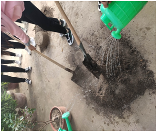 種植體驗(yàn)活動(dòng)前,為了讓學(xué)生更好地了解種植知識(shí),張老師給同學(xué)們講解了植物種植的條件、如何根據(jù)季節(jié)選擇種植的種類,以及育苗、澆水、施肥、防蟲過程中的注意事項(xiàng)。在活動(dòng)中,學(xué)生與老師合作完成種菜任務(wù),一起探討種植經(jīng)驗(yàn)、勞動(dòng)技能。