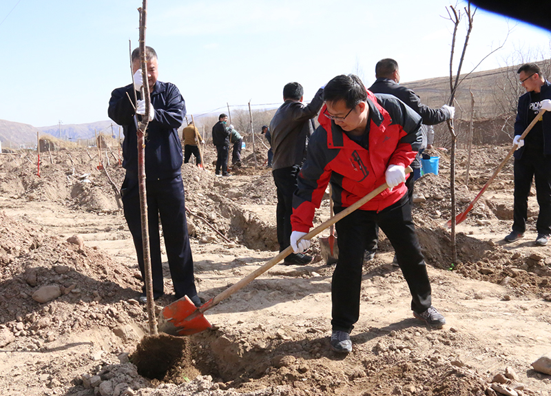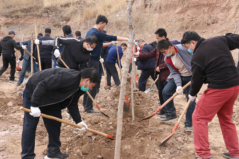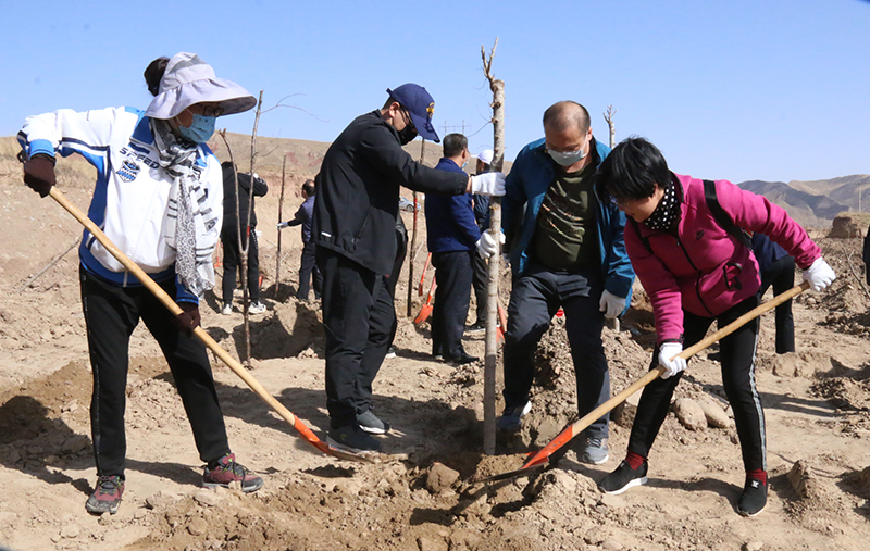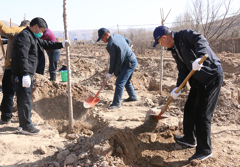 春風(fēng)吹拂處,新綠綻枝頭。為深入學(xué)習(xí)貫徹習(xí)近平總書記視察甘肅的重要講話和批示精神,認真踐行綠水青山就是金山銀山的發(fā)展理念,實施綠色發(fā)展戰(zhàn)略,進一步加強祁連山生態(tài)環(huán)境保護與治理,幫助幫扶鎮(zhèn)打贏脫貧攻堅戰(zhàn),實施鄉(xiāng)村振興戰(zhàn)略,4月9日,學(xué)院領(lǐng)導(dǎo)班子成員、幫扶干部、駐村干部及部分教職工70多人深入結(jié)對幫扶鎮(zhèn)——黑松驛鎮(zhèn)開展義務(wù)植樹活動,建設(shè)“生態(tài)示范林”。春光沐浴的祁連山腳下黑松驛鎮(zhèn),春意盎然,生機勃勃,正是植樹好時節(jié)。廣大教職工一下車就拿起鐵鍬到植樹現(xiàn)場,與黑松驛鎮(zhèn)政府部分干部一起投入植樹活動,按照“橫看直線側(cè)一線、三埋兩踩一提苗”的技術(shù)要求,三人一組,分工協(xié)作,有序配合,揮鍬培土、扶苖踩土、圍堰澆水,現(xiàn)場一派熱火朝天的勞動景象。當(dāng)天植樹育林約20余畝,一棵棵新栽的樹苗整齊排列,迎風(fēng)挺立。通過義務(wù)植樹,廣大教職工用實際行動傳播著生態(tài)文明、綠色發(fā)展理念,切實幫助幫扶鎮(zhèn)綠起來,美起來,富起來。