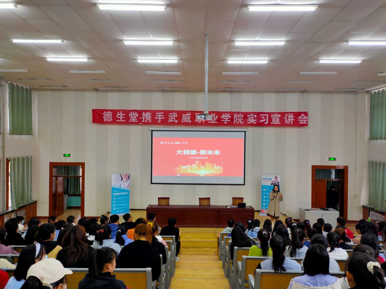2020年11月5日,武威職業(yè)學院藥學系攜手德生堂在正德廳舉辦實習宣講會。藥學系黨總支書記、主任魏潤明、藥學系副主任楊建美、德生堂集團武威區(qū)域經理呂福英及2021屆172名畢業(yè)生參加宣講會。