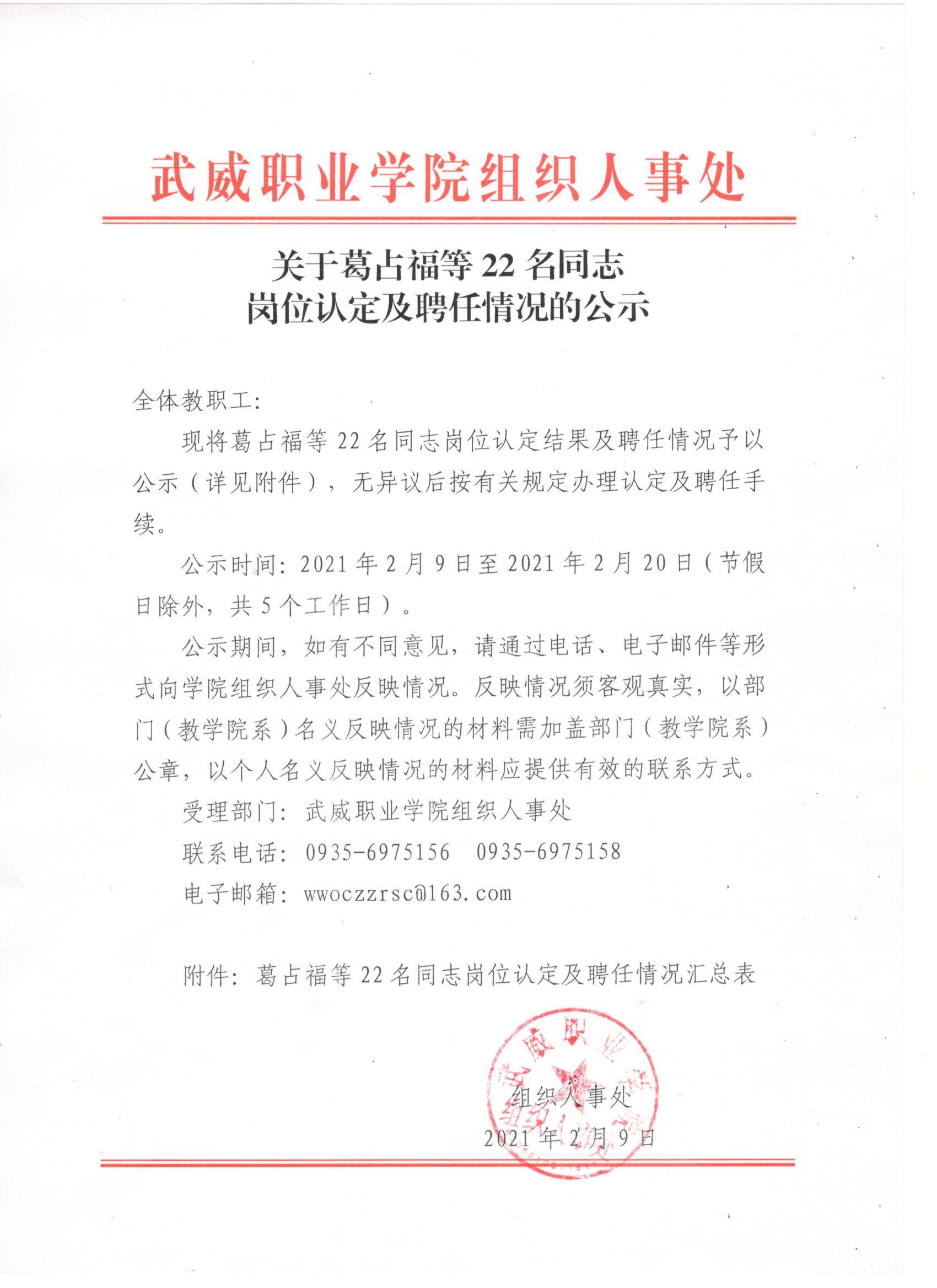 關(guān)于葛占福等22名同志崗位認(rèn)定及聘任情況的公示