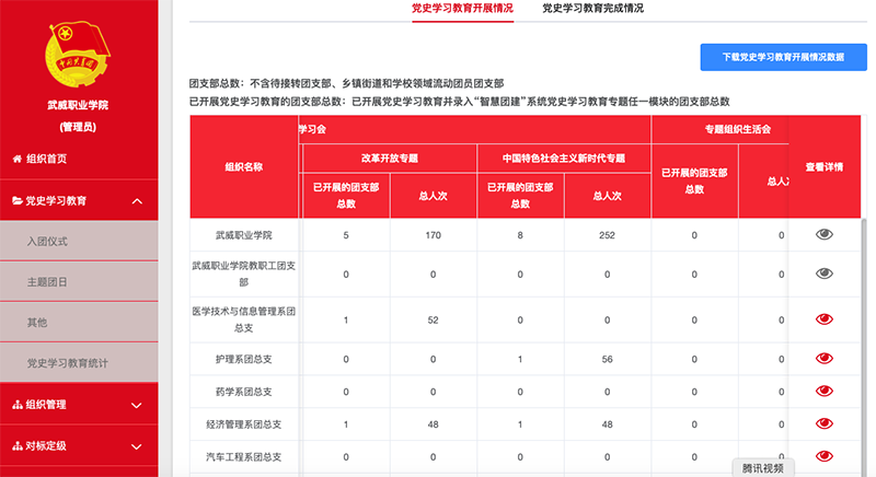通過(guò)智慧團(tuán)建黨史學(xué)習(xí)教育專區(qū),可以更好的實(shí)現(xiàn)對(duì)團(tuán)組織、團(tuán)干部、團(tuán)員黨史學(xué)習(xí)教育情況的動(dòng)態(tài)采集,構(gòu)建全團(tuán)大數(shù)據(jù)統(tǒng)計(jì),及時(shí)掌握各級(jí)團(tuán)組織和團(tuán)員學(xué)習(xí)教育整體進(jìn)度,有針對(duì)性地做好監(jiān)督,實(shí)現(xiàn)對(duì)團(tuán)員團(tuán)干部的網(wǎng)絡(luò)化黨史學(xué)習(xí)指導(dǎo)管理,實(shí)時(shí)掌握?qǐng)F(tuán)員需求,創(chuàng)新活動(dòng)載體,切實(shí)推動(dòng)我院共青團(tuán)黨史學(xué)習(xí)教育活動(dòng)扎實(shí)開展。