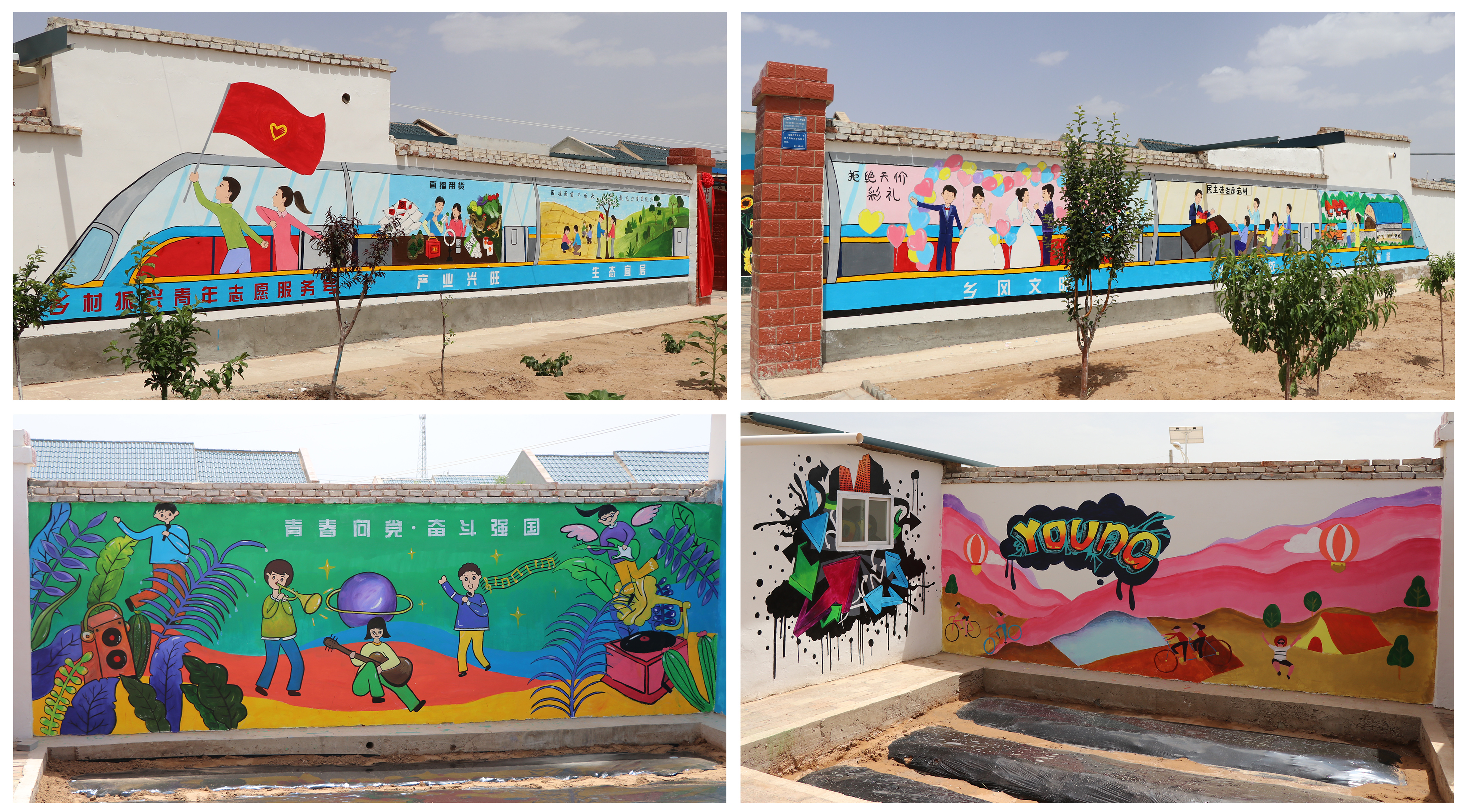 學院團委結(jié)合鄉(xiāng)村振興戰(zhàn)略和青年志愿服務工作特點對基地內(nèi)外墻體進行了彩繪設計,并組織人文藝術(shù)教育系師生完成了手工繪制。外墻以鄉(xiāng)村振興青年志愿服務號高速列車為主題,融入了鄉(xiāng)村振興戰(zhàn)略20字方針,產(chǎn)業(yè)興旺、生態(tài)宜居、鄉(xiāng)風文明、治理有效、生活富裕5個方面的總體目標。內(nèi)墻以青春時尚為主題,利用涂鴉的形式,展現(xiàn)青年人朝氣蓬勃、積極向上,青春向黨、奮斗強國的精神風貌。