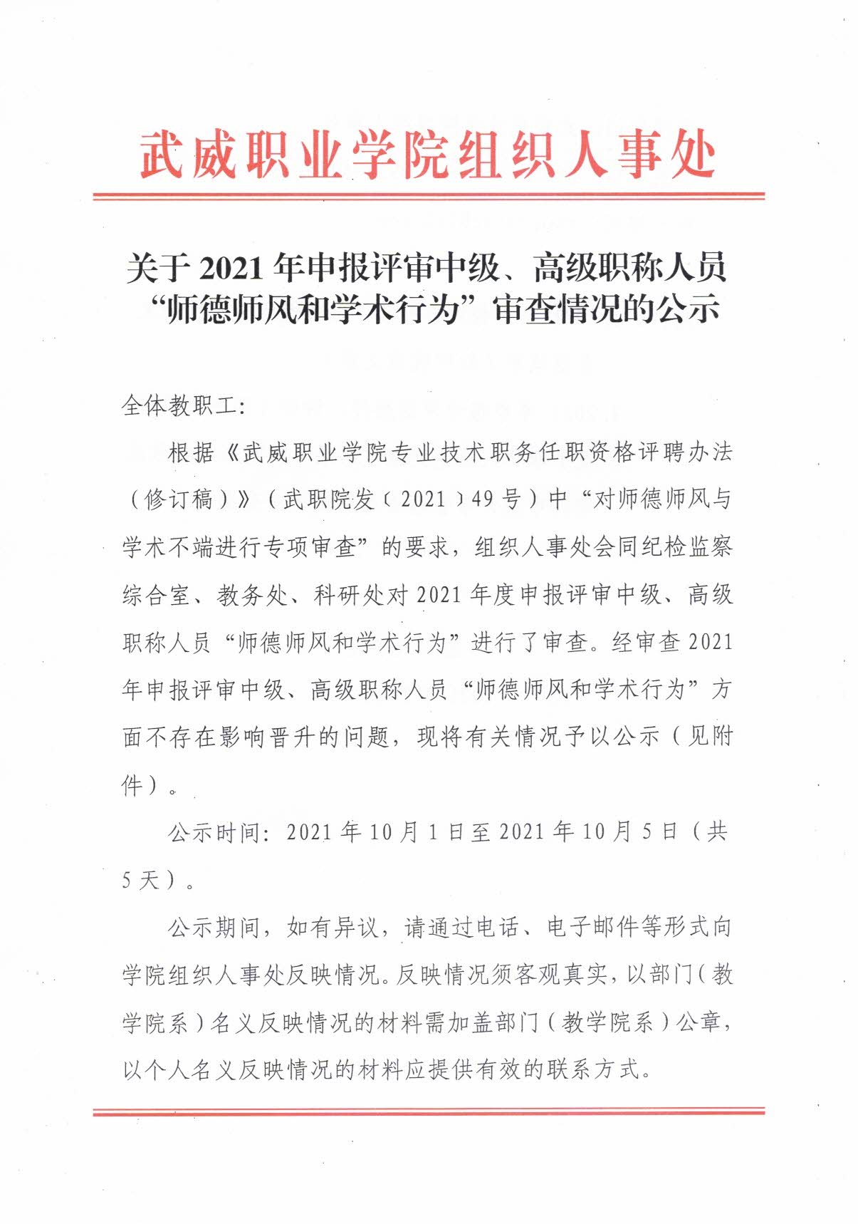 關(guān)于2021年申報評審中級、高級職稱人員“師德師風和學(xué)術(shù)行為”審查情況的公示
