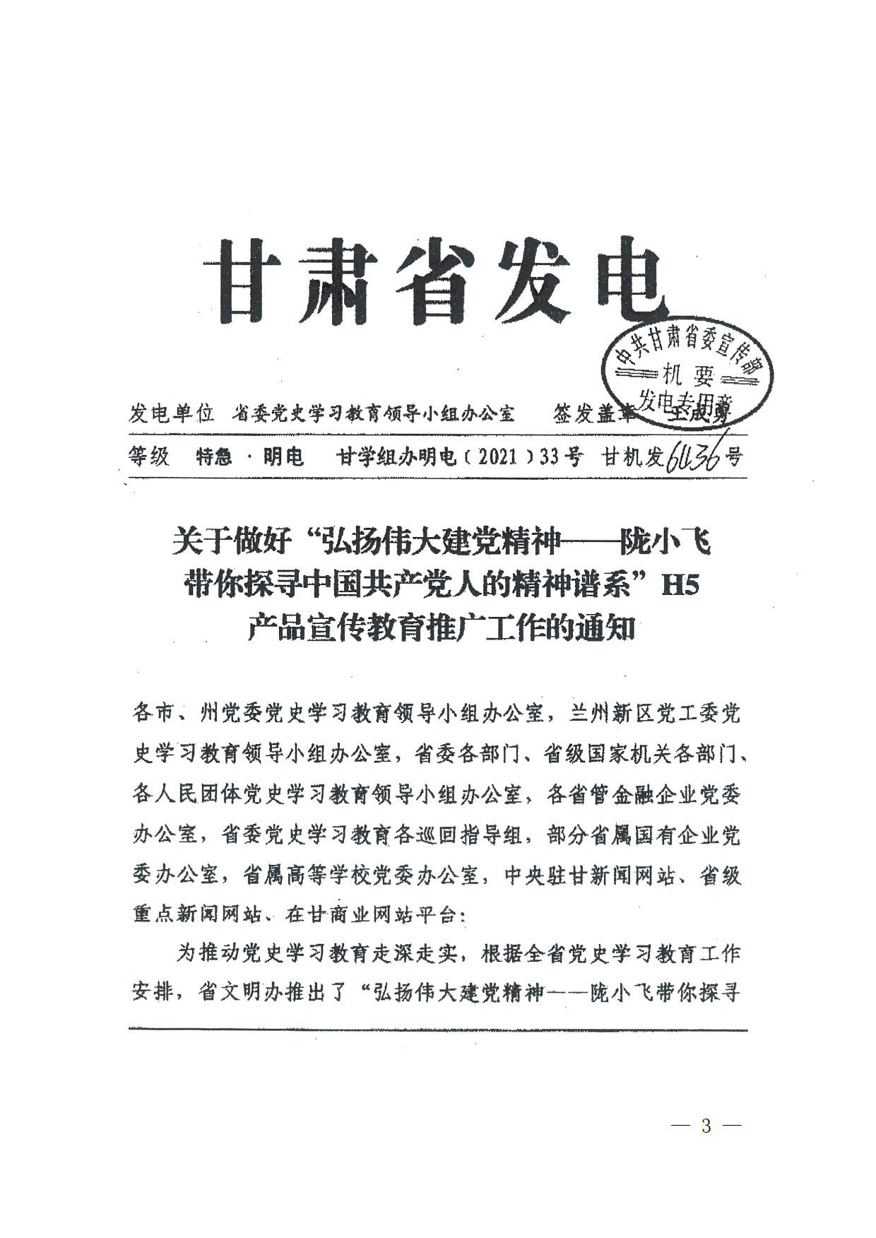 中共武威市委黨史學(xué)習(xí)教育領(lǐng)導(dǎo)小組辦公室關(guān)于轉(zhuǎn)發(fā)〈關(guān)于做好 “弘揚(yáng)偉大建黨精神——隴小飛帶你探尋中國共產(chǎn)黨人的精神譜系”H5產(chǎn)品宣傳教育推廣工作的通知〉的通知