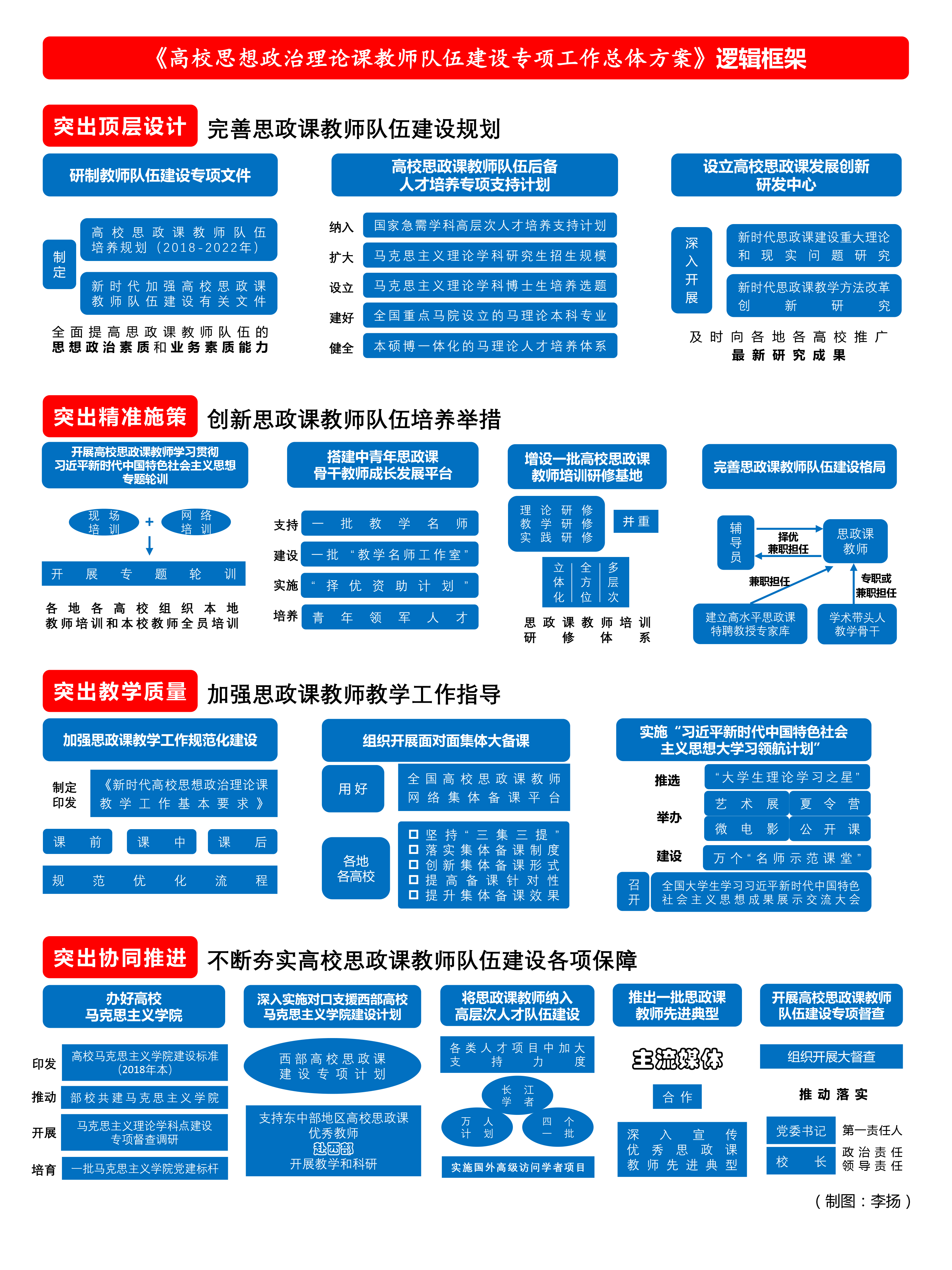 為全面推動習(xí)近平新時代中國特色社會主義思想進(jìn)教材進(jìn)課堂進(jìn)學(xué)生頭腦,聚焦提升思政課教師綜合素質(zhì)和專業(yè)化水平,繼續(xù)打好提高高校思政課質(zhì)量和水平的攻堅戰(zhàn),培養(yǎng)擔(dān)當(dāng)民族復(fù)興大任的時代新人,教育部決定2018年實施高校思想政治理論課教師隊伍建設(shè)專項工作,并于日前印發(fā)了工作總體方案。