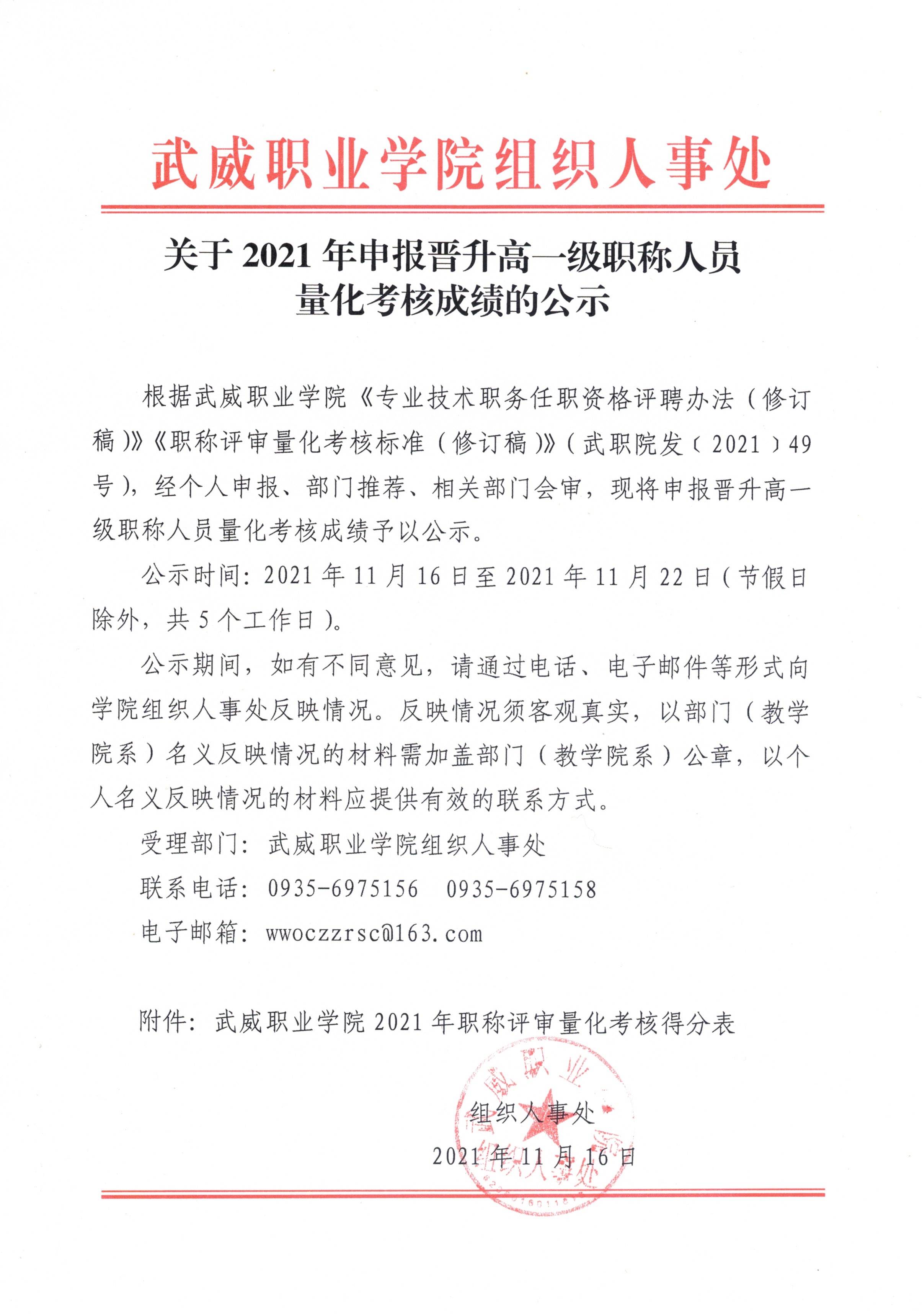 關(guān)于2021年申報(bào)晉升高一級職稱人員量化考核成績的公示