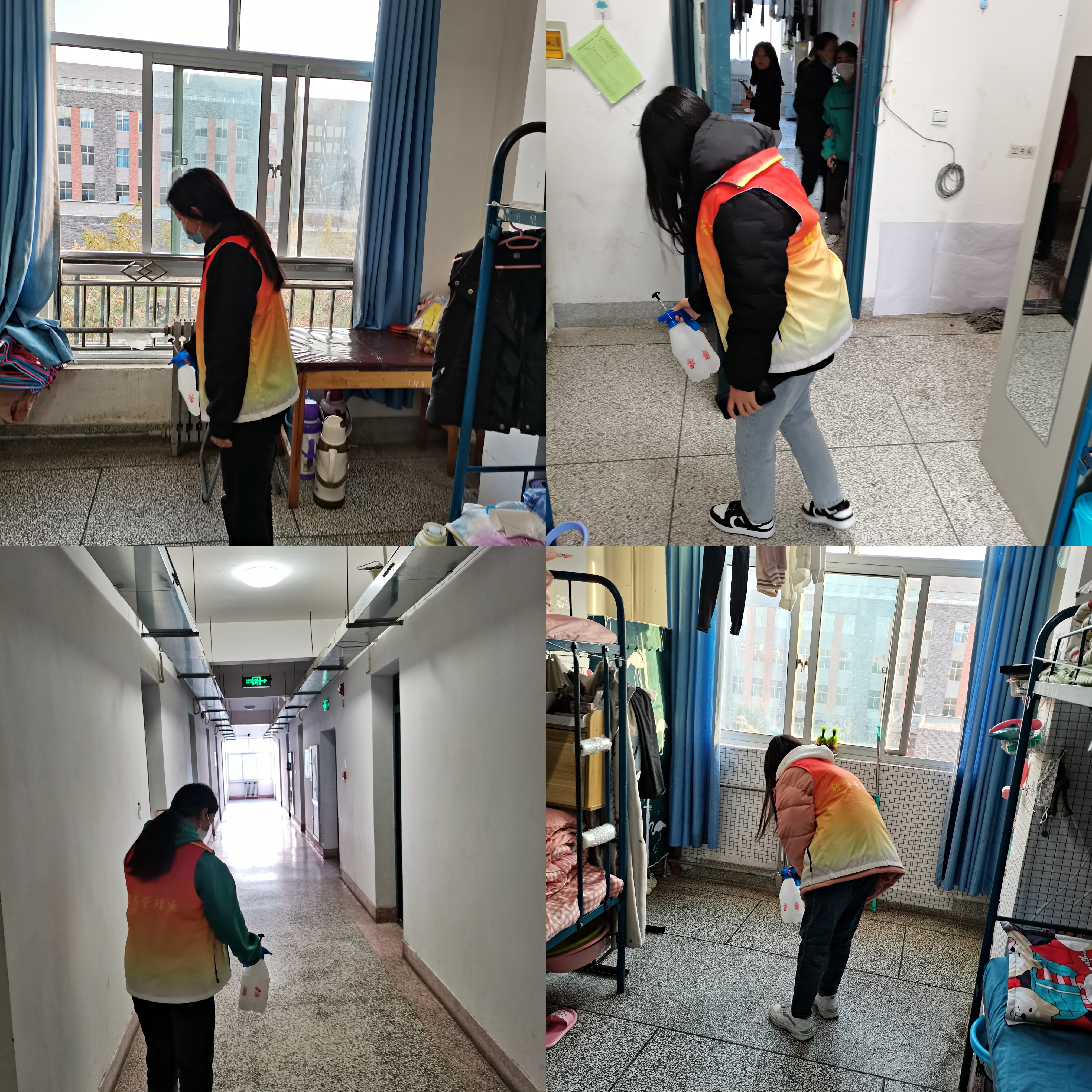 為切實抓好宿舍及公共區(qū)域防控消殺工作,營造安全舒適的學(xué)習(xí)生活環(huán)境,志愿者協(xié)會根據(jù)不同職能劃分為7個小組,按照“一天兩次”消殺頻率持續(xù)對經(jīng)緯樓、3號學(xué)生公寓等宿舍樓內(nèi)的學(xué)生宿舍進(jìn)行通風(fēng)消毒工作,重點對宿舍地面、床底、門角處等位置進(jìn)行全方位、多角度消毒,盡量做到消殺不留死角。同時,志愿者還通過網(wǎng)絡(luò)平臺學(xué)習(xí)疫情防控措施相關(guān)知識,并在消殺過程中為同學(xué)們普及疫情防控知識,全面加強(qiáng)宣傳引導(dǎo),幫助廣大師生在第一時間了解防疫資訊,有效杜絕謠言傳播,確保廣大師生情緒穩(wěn)定。